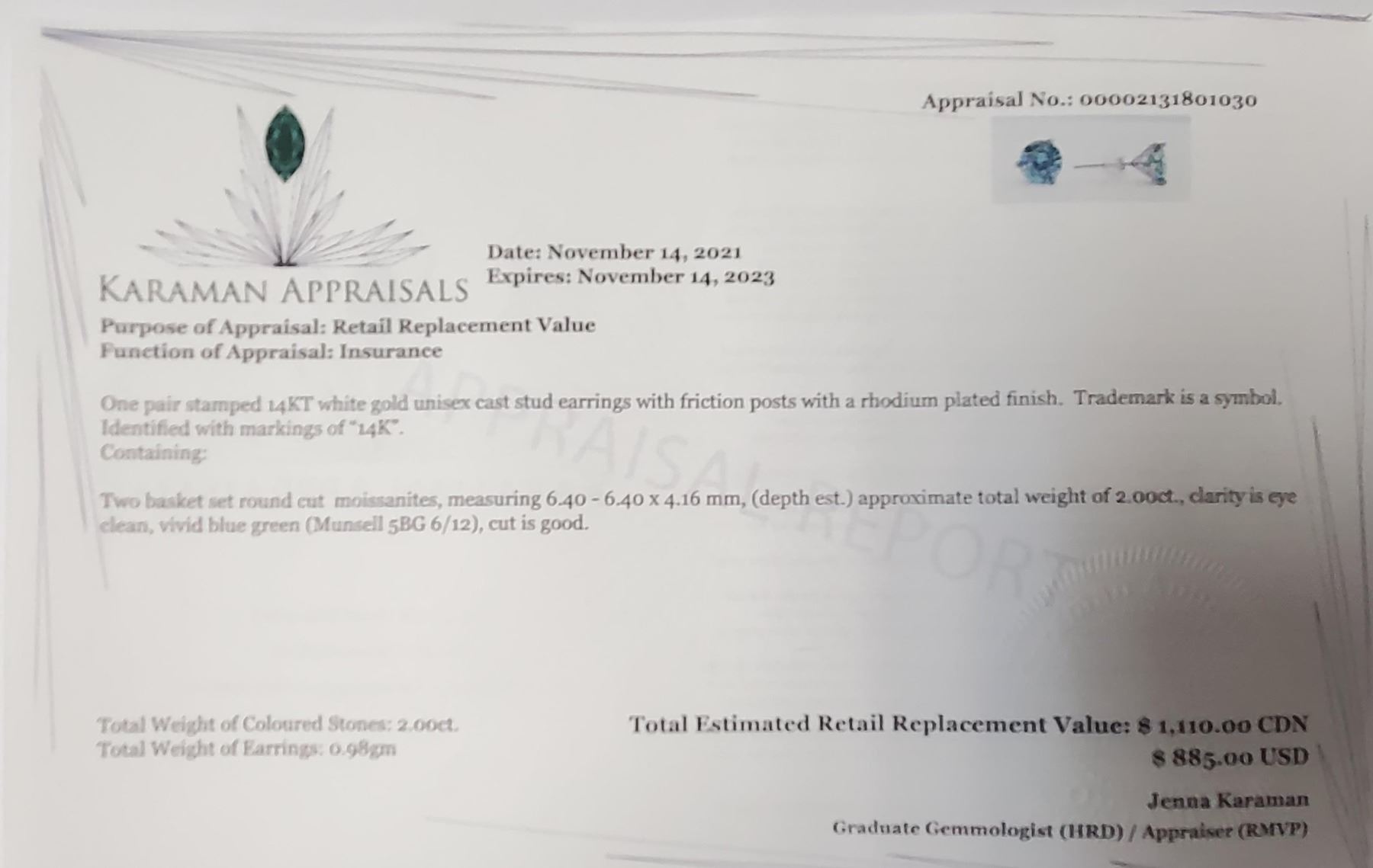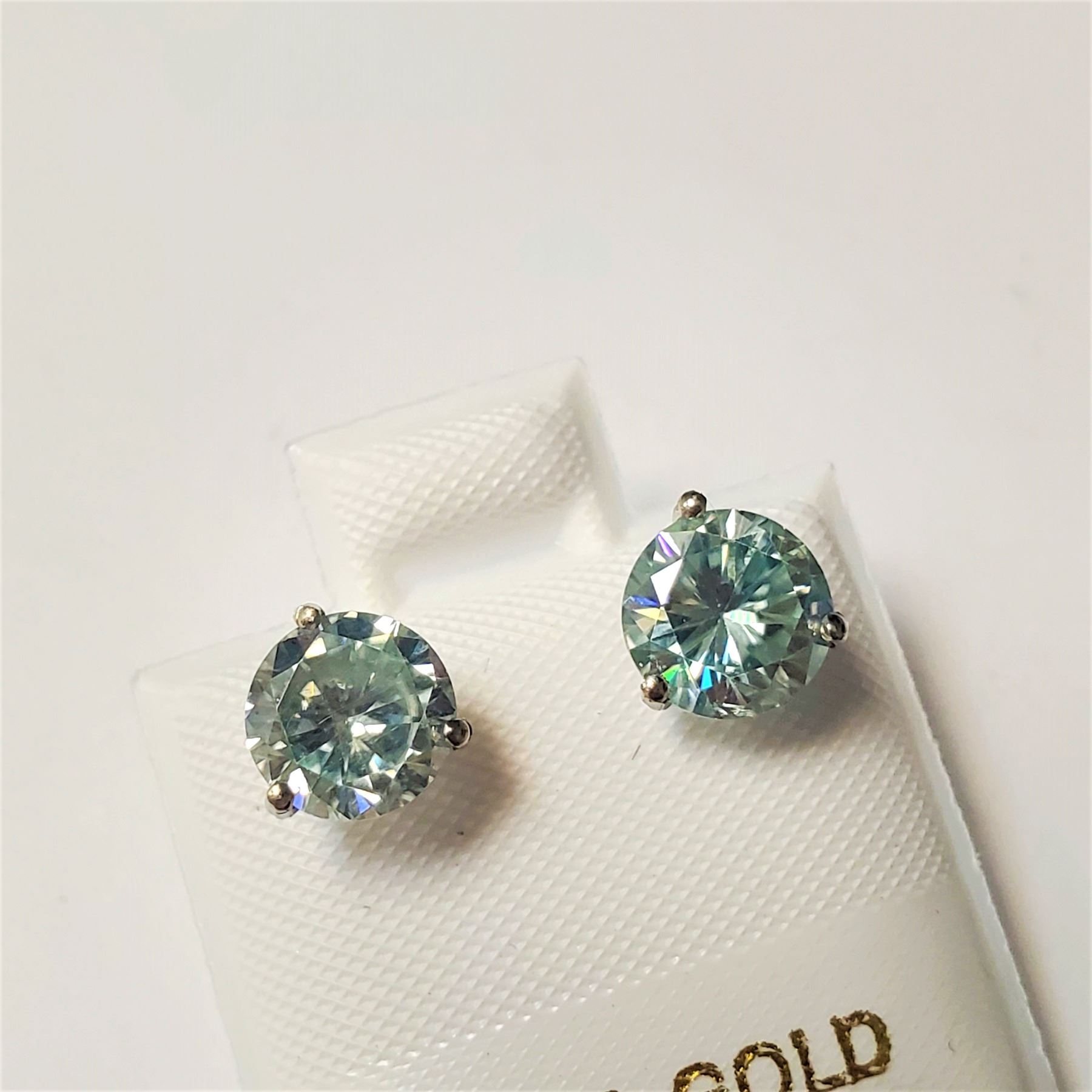 14K WHITE GOLD VIVID BLUE GREEN MOISSANITE(2CT) EARRINGS (~WEIGHT 0.98G), EARRINGS ARE DIFFERENT HUES, ONE IS NOTICABLY GREEN, THE OTHER IS NOTICABLY BLUE. APPRAISED RETAIL $1100 ALL ITEMS MUST BE REMOVED WITHIN 5 DAYS OF SALE