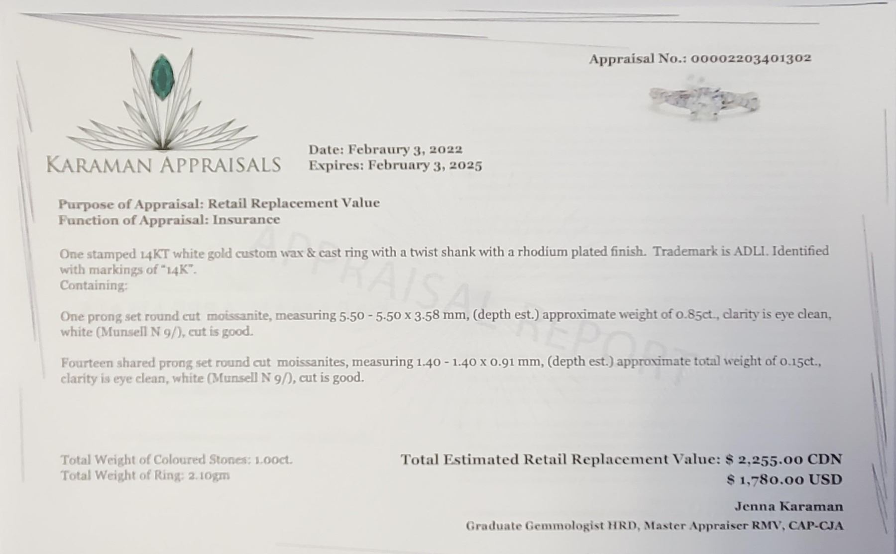 14K WHITE GOLD MOISSANITE(0.85CT) DIAMOND(0.15CT) RING SIZE 7 RING IS RESIZABLE FOR $40 (~WEIGHT 2.1G), MADE IN CANADA, APPRAISED RETAIL $2255**ALL ITEMS MUST BE REMOVED BY 5PM FRIDAY, SEPTEMBER 16ND, 2022. ALL REMAINING ITEMS WILL BE SUBJECT TO A $6.00 PER DAY STORAGE CHARGE. ANY ITEMS REMAINING AFTER FRIDAY, SEPTEMBER 16, 2022 WILL BE CONSIDERED FORFEITED. NO REFUNDS WILL BE ISSUED FOR FORFEITED ITEMS.** TO SCHEDULE A PICK UP APPOINTMENT. CLICK HERE