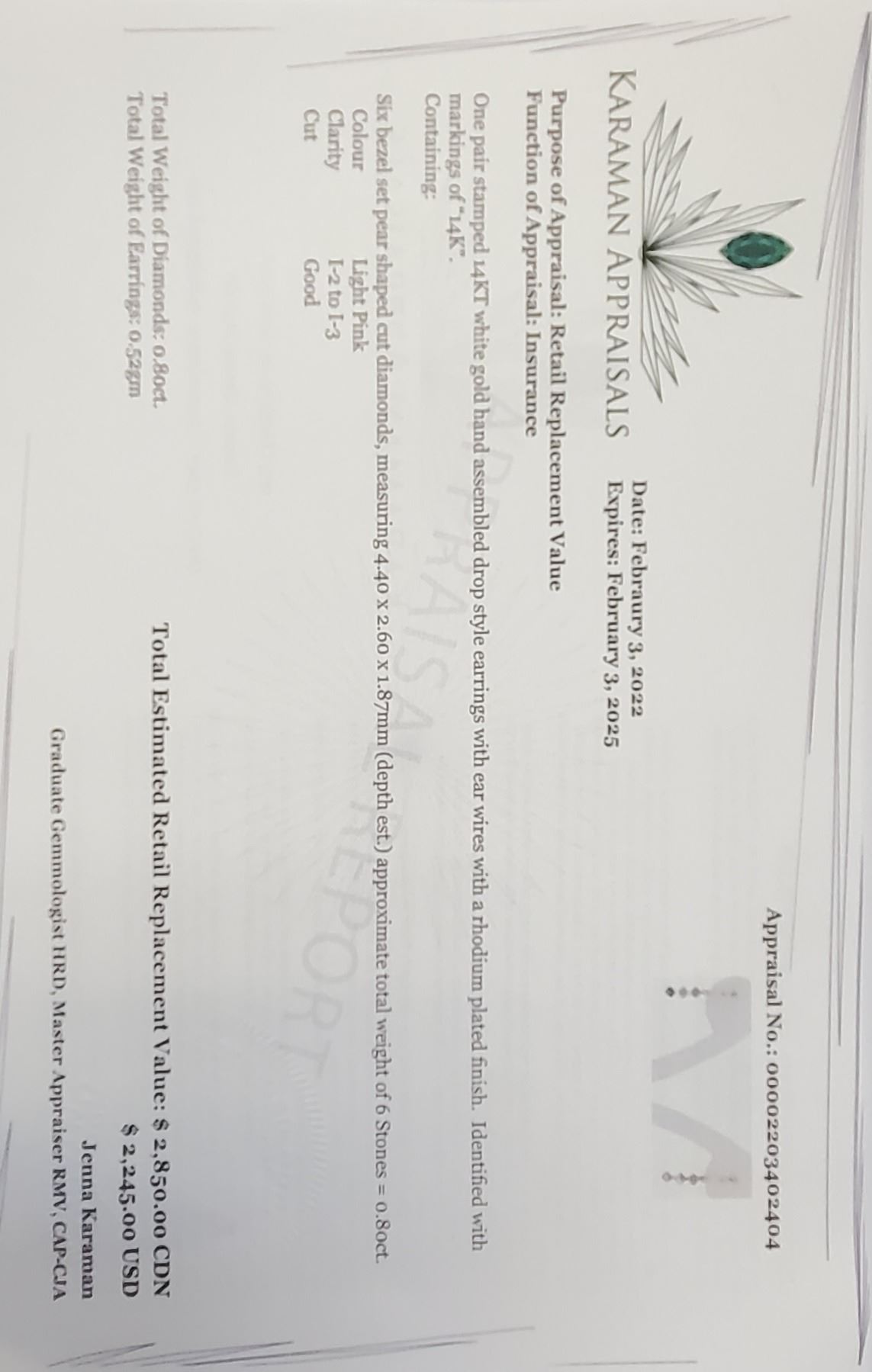 14K WHITE GOLD DIAMOND (0.8CT,I2-3,LIGHT PINK) EARRINGS (~WEIGHT 0.52G), APPRAISED RETAIL $2850