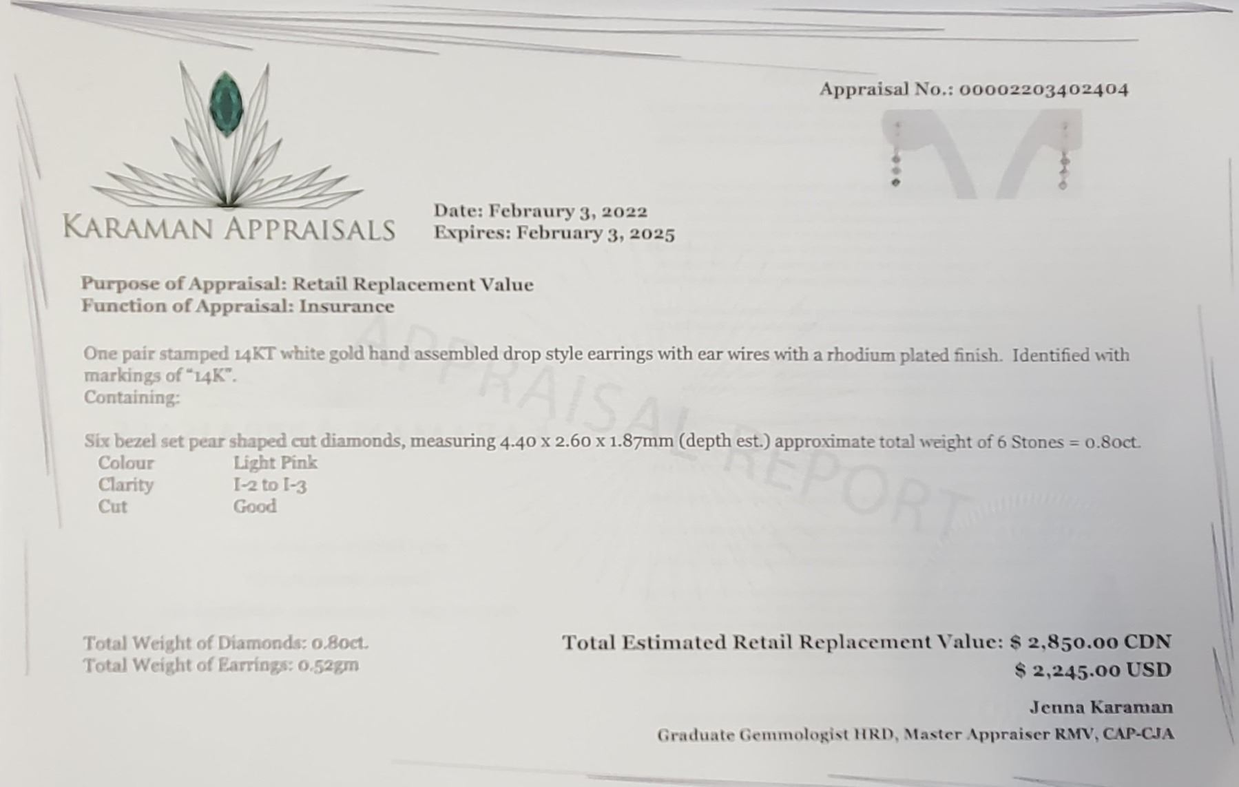 14K WHITE GOLD DIAMOND (0.8CT,I2-3,LIGHT PINK) EARRINGS (~WEIGHT 0.52G), APPRAISED RETAIL $2850 ALL ITEMS MUST BE REMOVED WITHIN 5 DAYS OF SALE