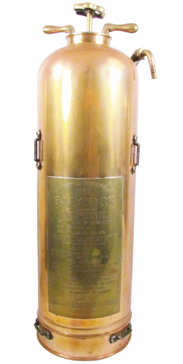 Babcock Copper Fire Extinguisher with strap mounting brackets. A couple of dents otherwise good condition. 29 1/2 inches tall.