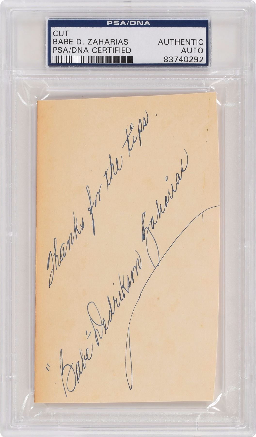 Ink signature, "Thanks for the tips, 'Babe' Didrikson Zaharias,” on an off-white 3 x 5 sheet. Encapsulated in a plastic PSA/DNA authentication holder. In fine condition.