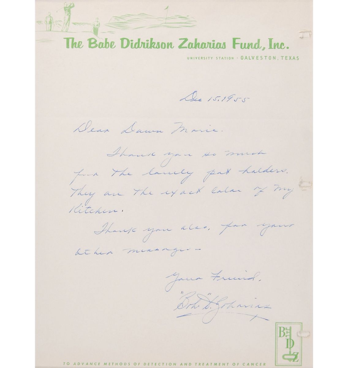 ALS signed “‘Babe’ D. Zaharias,” one page, 8 x 10.5, The Babe Didrickson Zaharias Fund Inc. letterhead, December 15, 1955. Letter of thanks for a gift. In full: “Thank you so much for the lovely pot holders. They are the exact color of my kitchen. Thank you also for your other messages.” Suede-matted and framed with an unsigned FDC featuring a color silk cachet of Didrikson to an overall size of 15.5 x 24.5. In fine condition, with punch holes to right edge. Oversized.