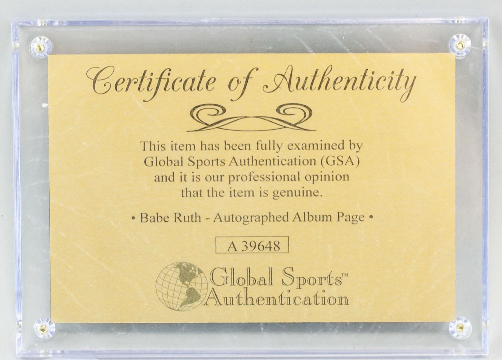 Babe Ruth autograph pressed between glass. Accompanied with Certificate of Authenticity. 9.5 x 11.8 cm, Case size: 12.8 x 17.5 cm.