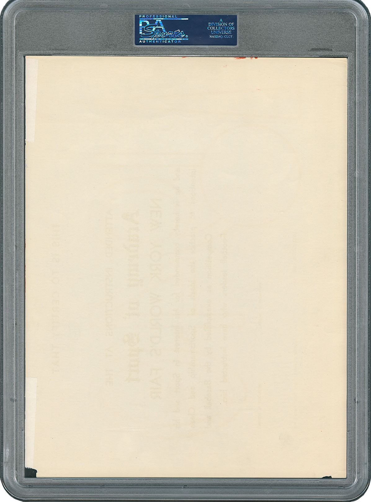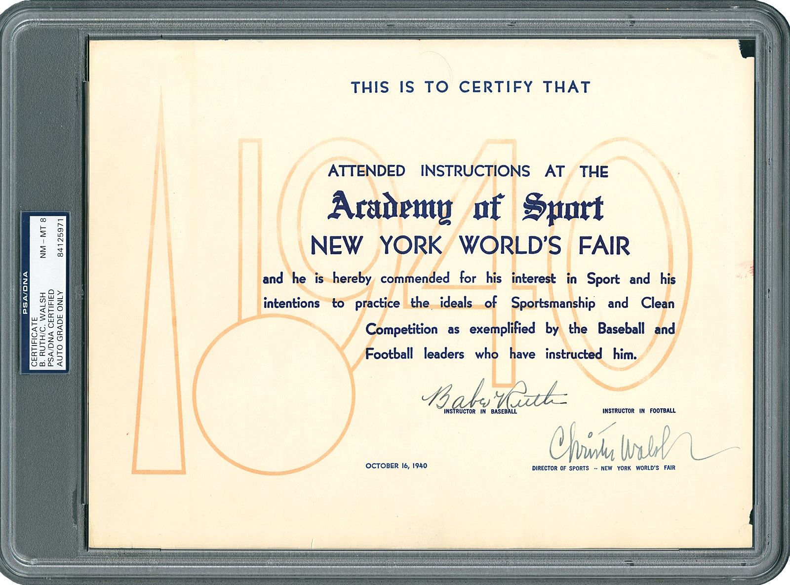 Offered is an un-issued 1940 NY World's Fair Academy of Sport attendance certificate, signed by both Babe Ruth and his uber-agent Christy Walsh. The single page 8.5 x 11 inch certificate reads, in part: "This is to certify that [blank] attended instructions at the Academy of Sport New York World's Fair and he is hereby commended for his interest in Sport and his intentions to practice the ideals of Sportsmanship and Clean Competition as exemplified by the Baseball and Football leaders who have instructed him." Signed at the conclusion by Babe Ruth, and also signed by Ruth's pioneering agent and World's Fair Director of Sports Christy Walsh. In very good overall condition, with minor paper loss to the upper right corner tip and a tiny chip along the right edge. When issued, these certificates would be filled out with the recipient's name and sealed with a ribbon and gold foil seal at lower left. A seldom-seen memento of the home-run champion's ever-enduring love of the game, and the young fans who would carry it into the future. Encapsulated by PSA/DNA, with both signatures grading NM-MT 8.