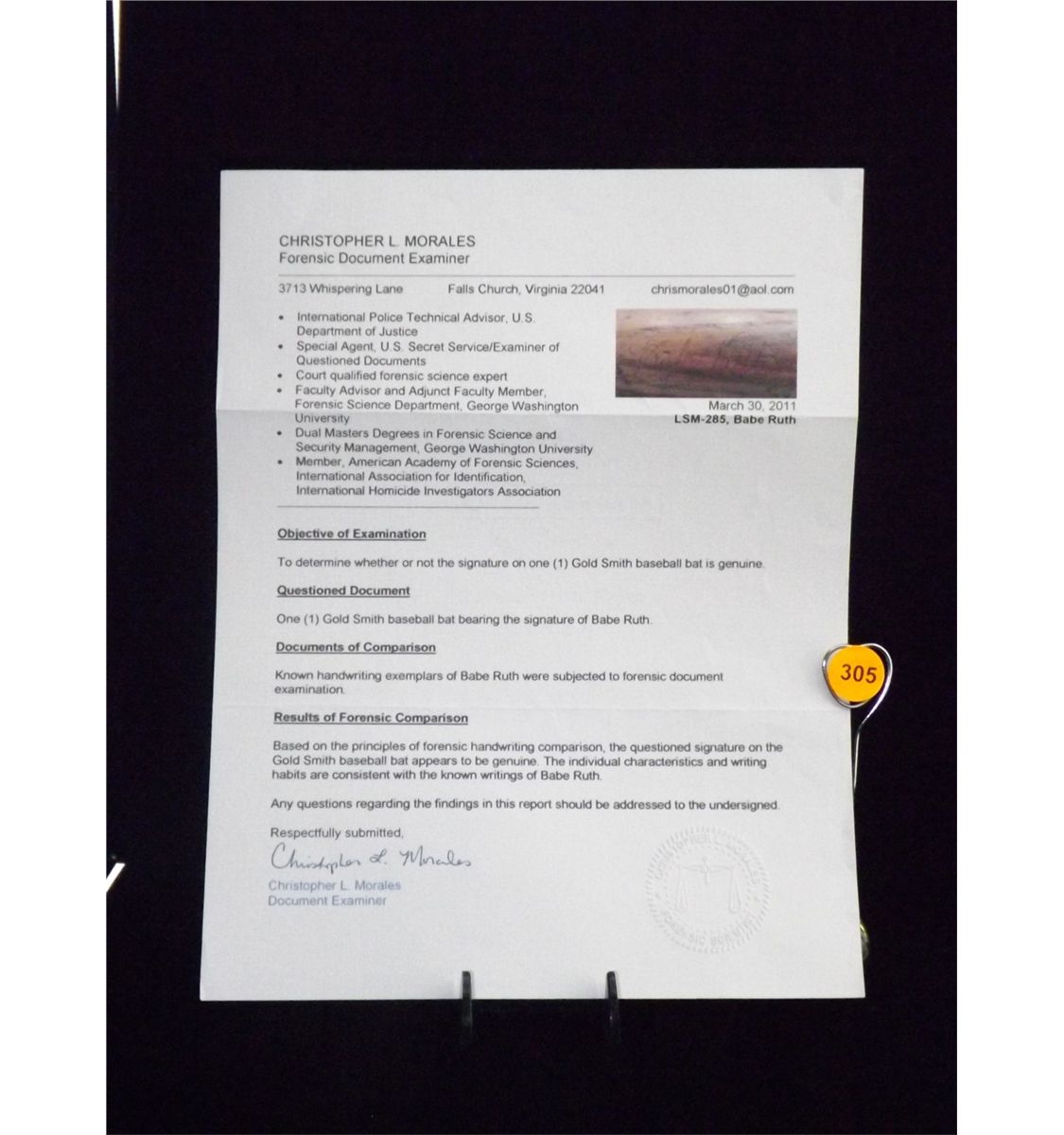 Babe Ruth Autographed Baseball Bat. Goldsmith Baseball Bat. Appraised or estimated retail value $28000. COA by Christopher Morales. All Sales Final. Please see terms and conditions of auction.
