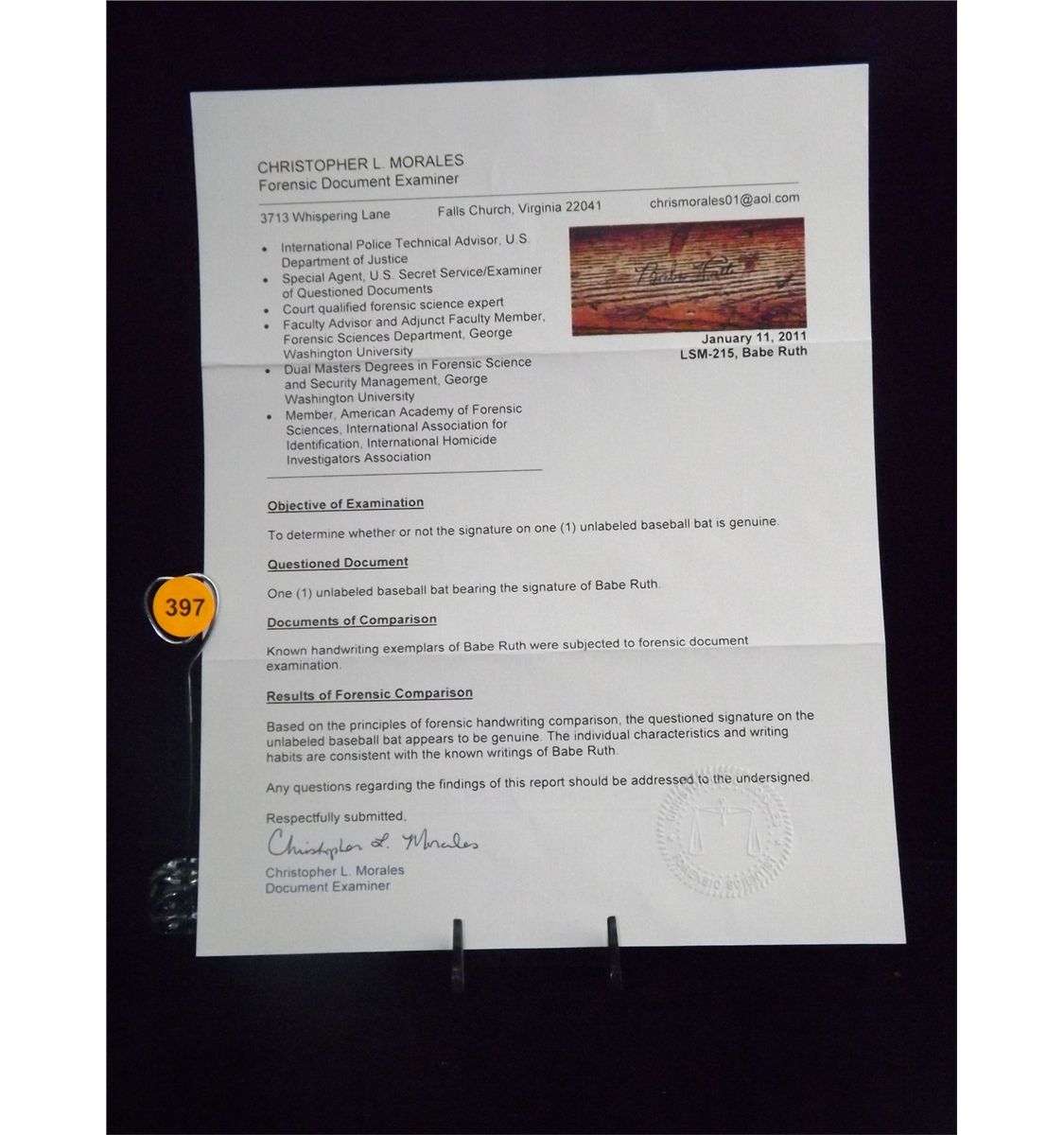 Babe Ruth Autographed Baseball Bat. Unlabeled Bat. Appraised or estimated retail value $42,000. COA by Christopher Morales. All Sales Final. Please see terms and conditions of auction.