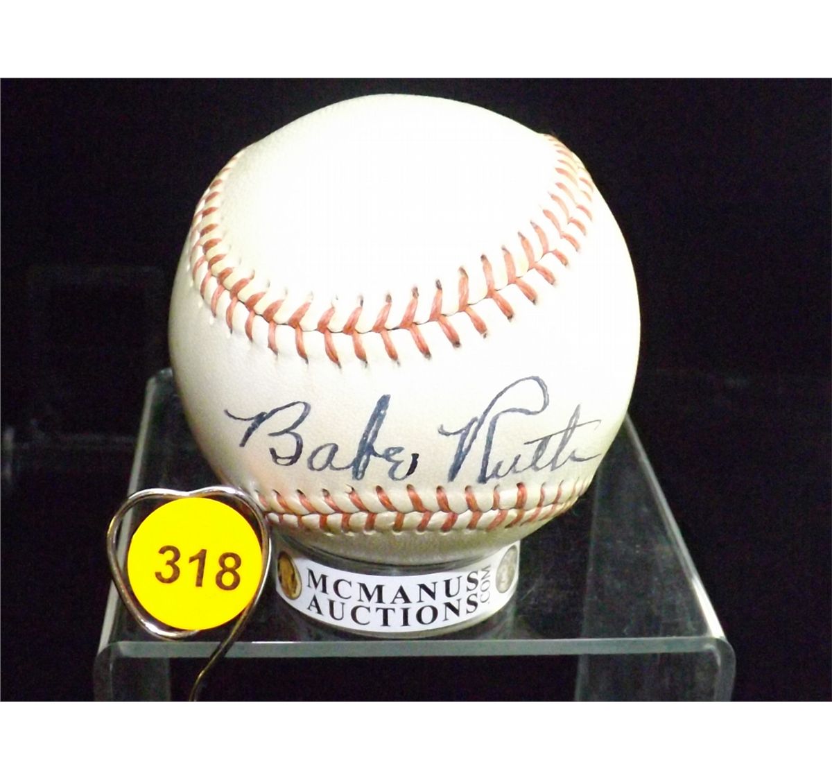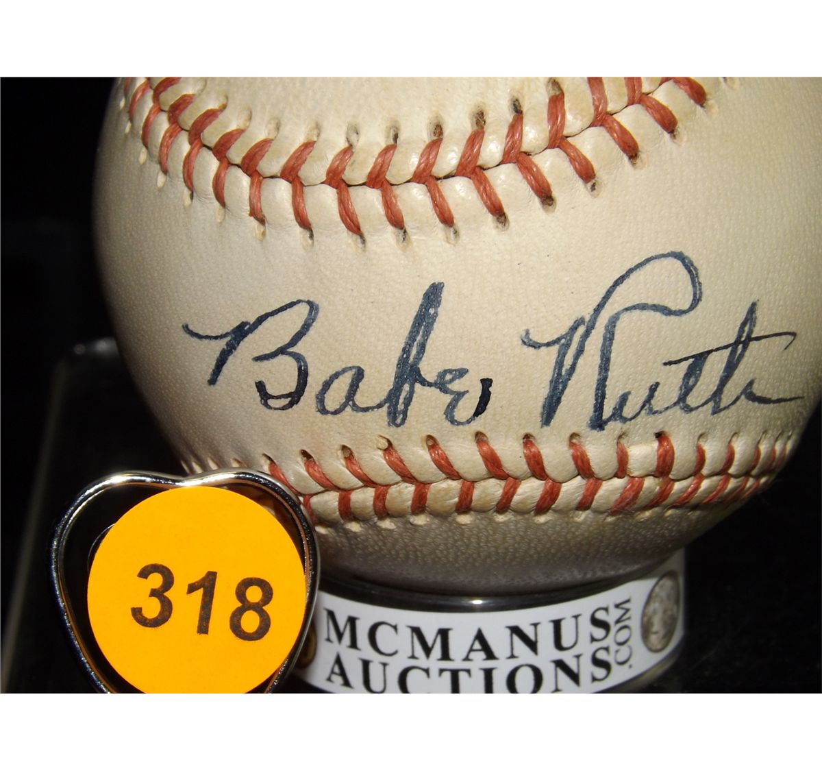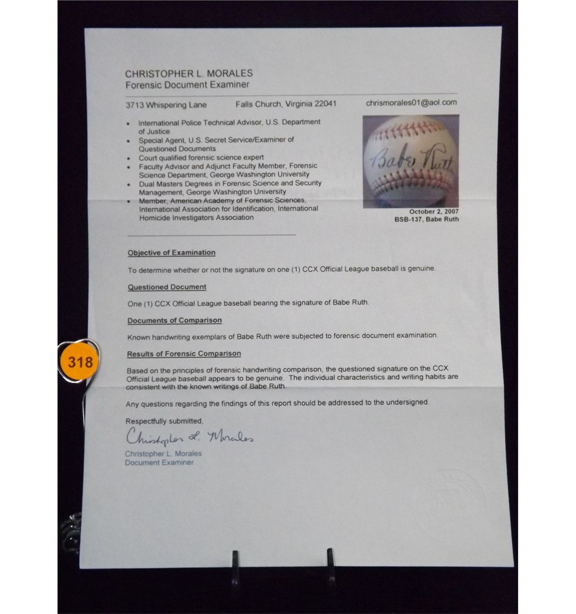 Babe Ruth Autographed Baseball. CCX Official League Baseball. Appraised or estimated retail value $22000. COA by Christopher Morales. All Sales Final. Please see terms and conditions of auction.