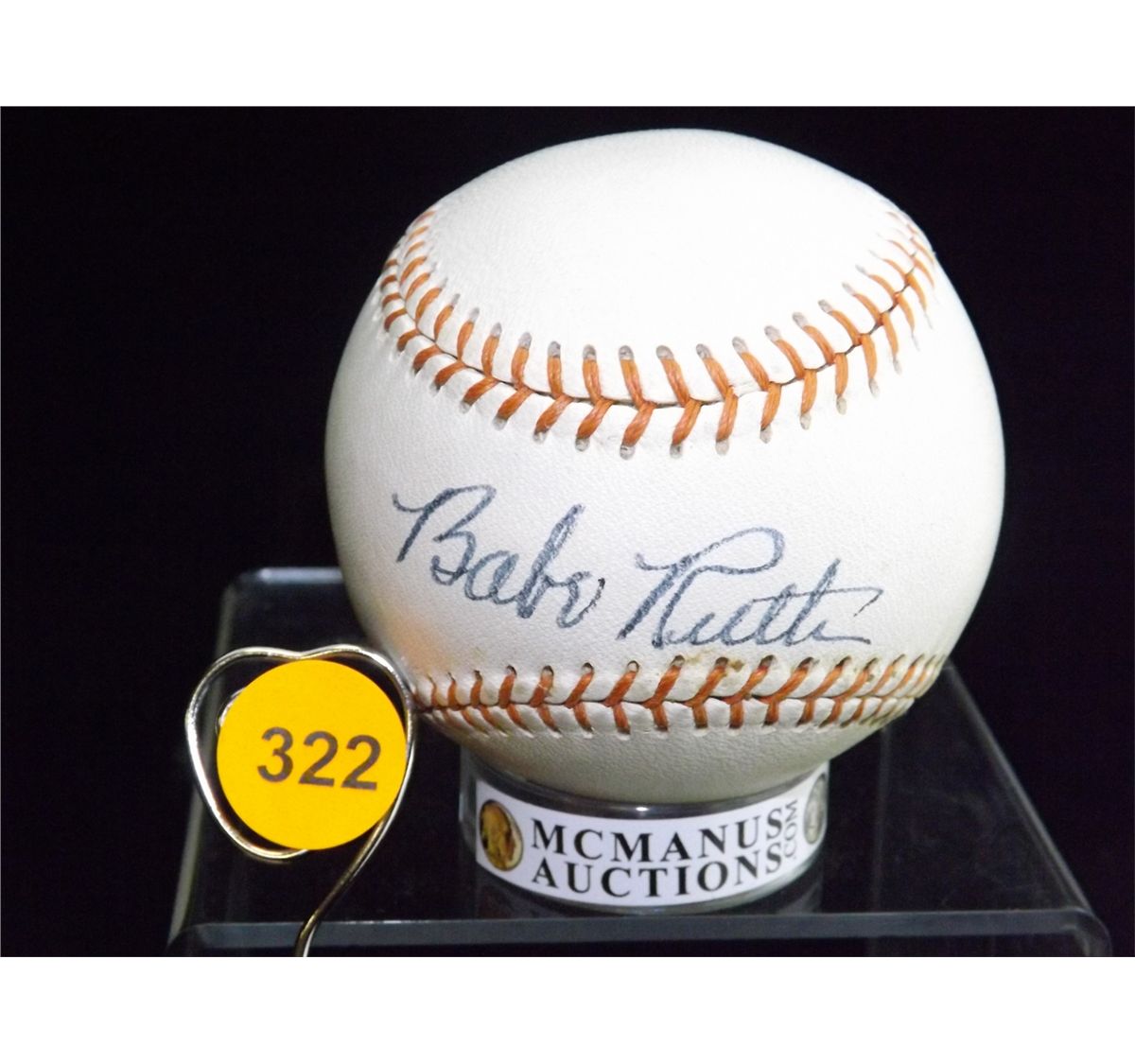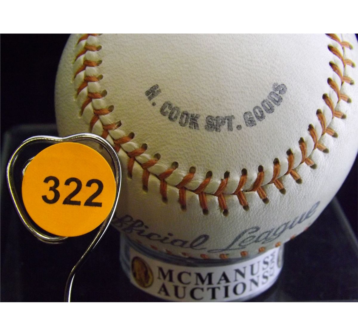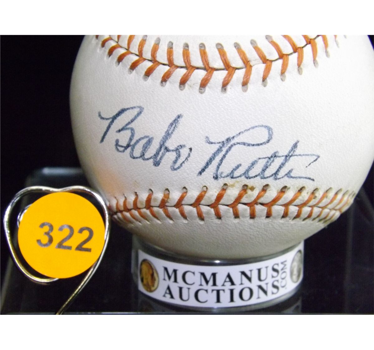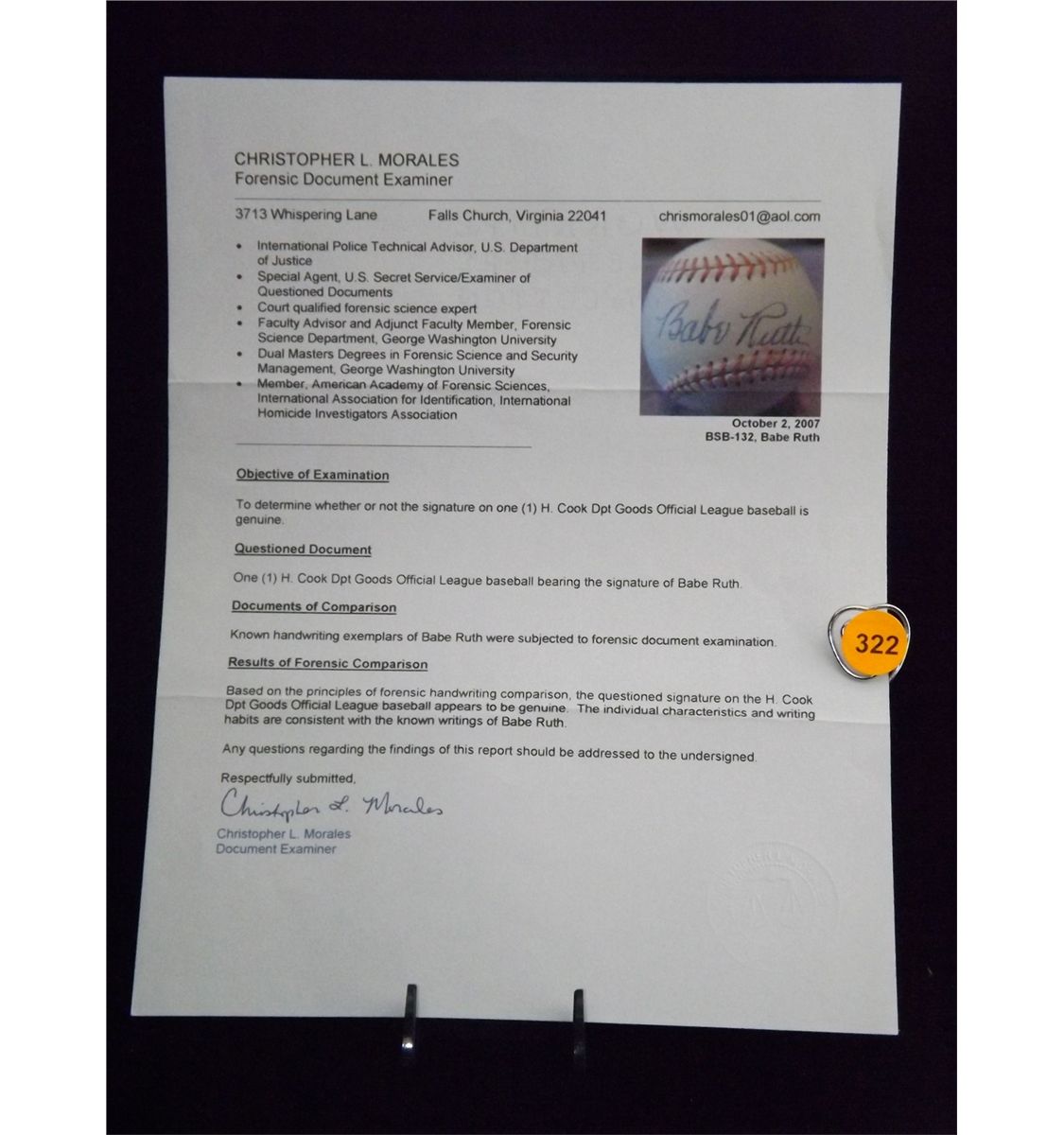 Babe Ruth Autographed Baseball. H. Cook Dpt. Goods Oficial League Baseball. Appraised or estimated retail value $20000. COA by Christopher Morales. All Sales Final. Please see terms and conditions of auction.