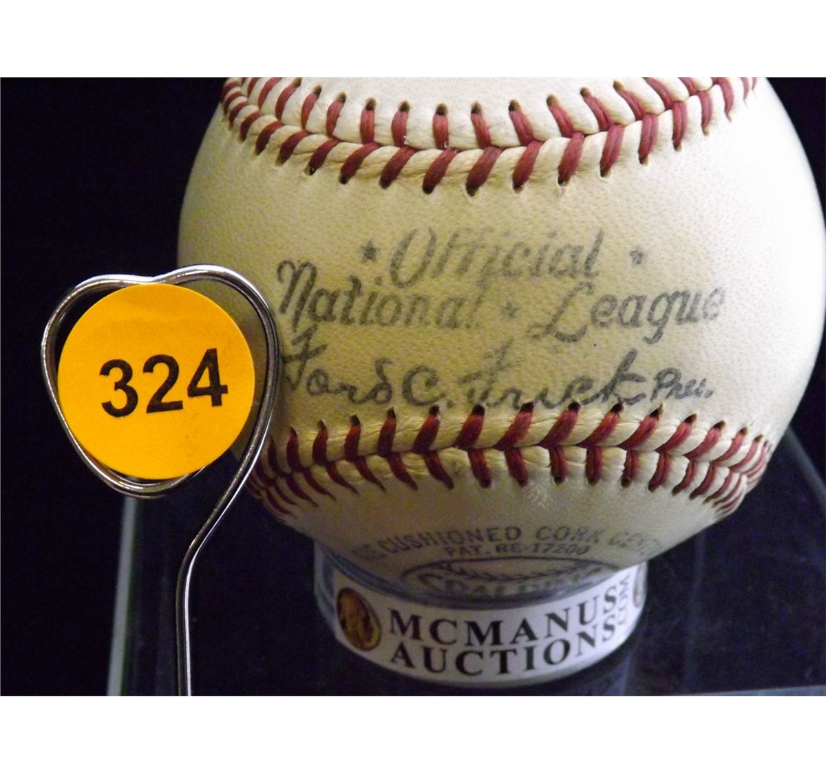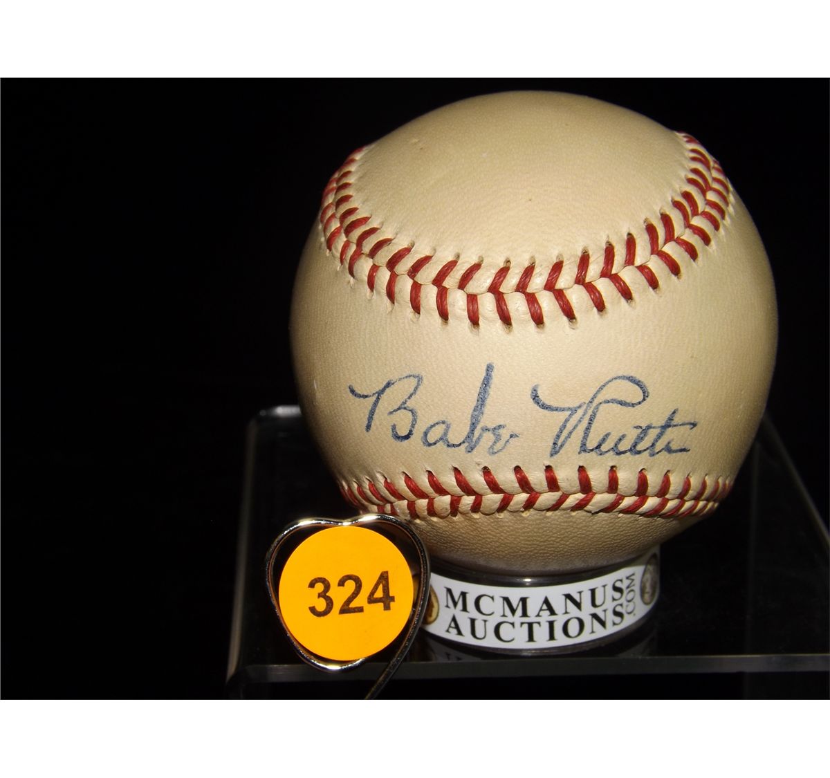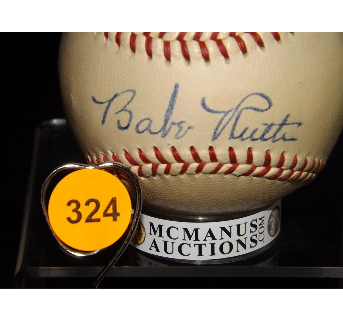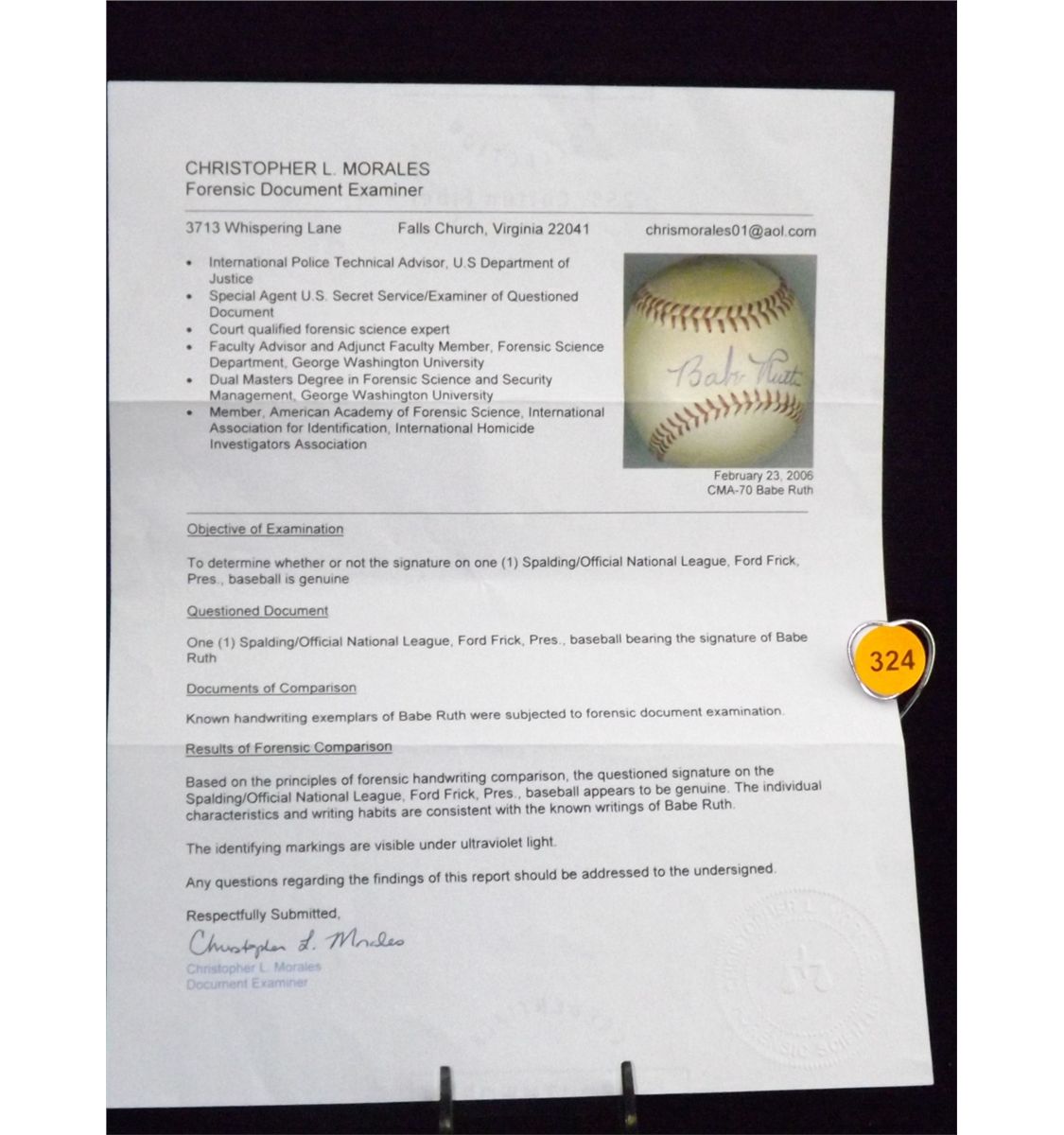 Babe Ruth Autographed Baseball. Spalding Official Ford Frick Pres. NLB. Appraised or estimated retail value $35000. COA by Christopher Morales. All Sales Final. Please see terms and conditions of auction.