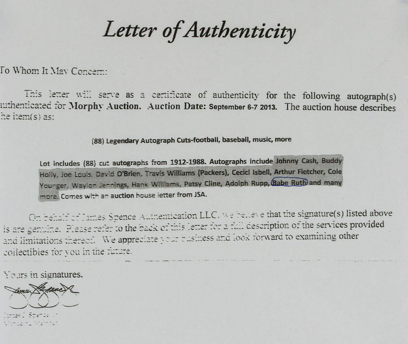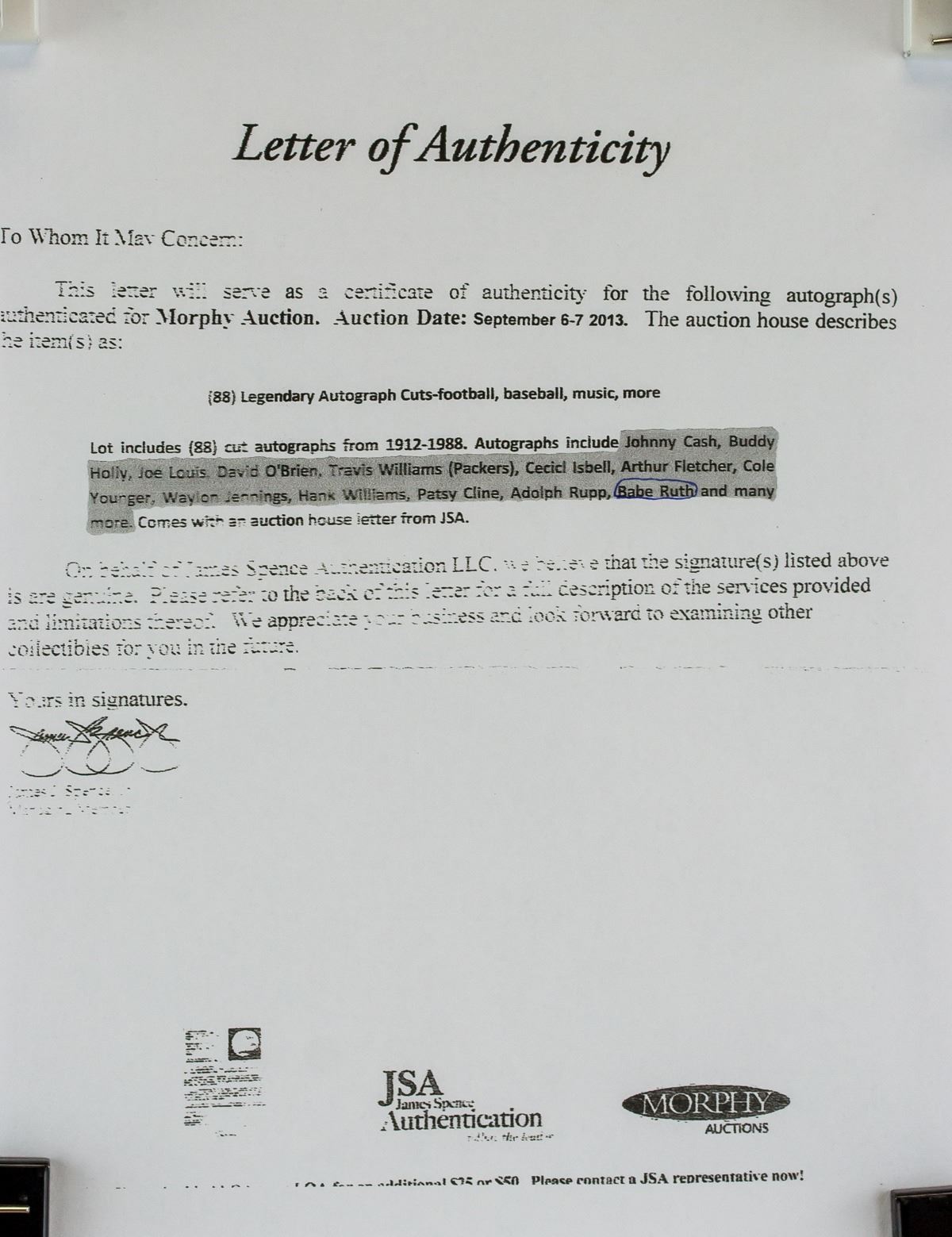 Babe Ruth cut autograph. Accompanied with Letter of Authenticity. Photograph not included. 3 x 8.5 cm