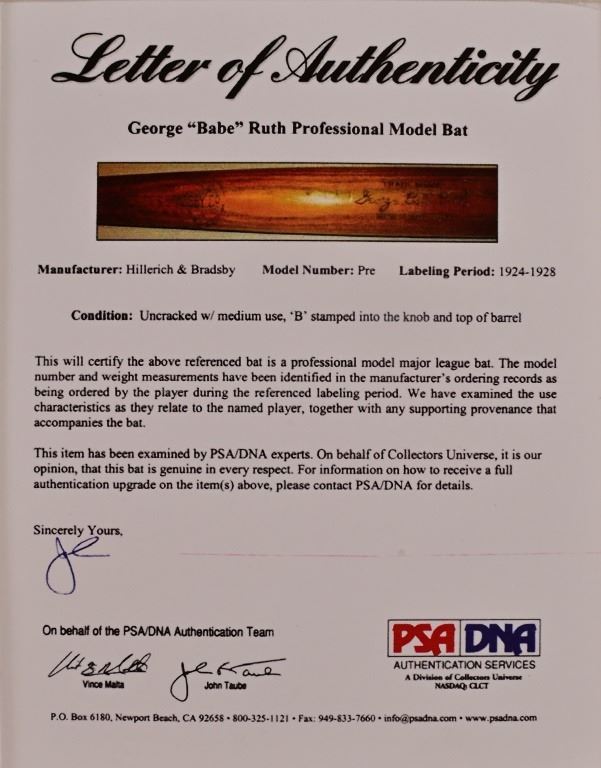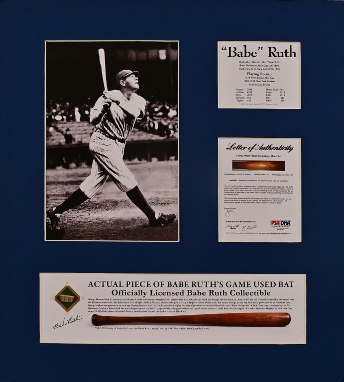 Babe Ruth game used bat fragment. PSA authenticated. 18x20 inches. TR150