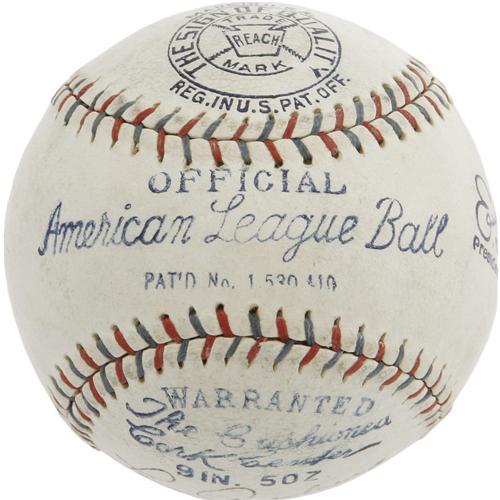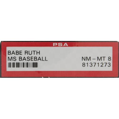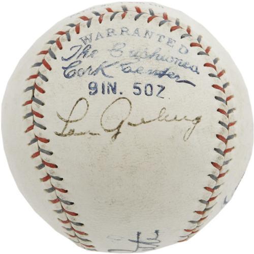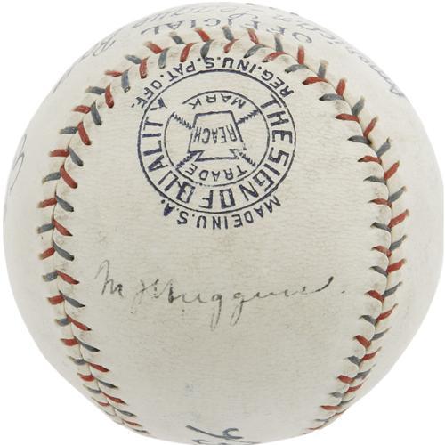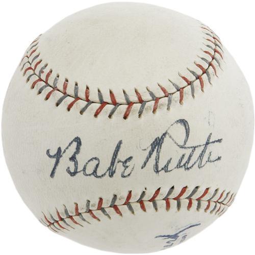 <B>1920's Babe Ruth, Lou Gehrig & Miller Huggins Signed Baseball, PSA NM-MT 8.</B></I> No superlative seems appropriately strong when it comes to describing this remarkable sphere compiling the three most important Hall of Fame autographs from the Murderer's Row days at Yankee Stadium. While even the most casual collector is aware of how desirable a Ruth/Gehrig duo is, the addition of the diminutive Yankee skipper to a ball featuring the superstar sluggers lifts this ball to the absolute peak of the hobby. Of the multitudes of future Cooperstown residents to wear pinstripes during baseball's Golden Age, Huggins is unquestionably the toughest, having succumbed suddenly to blood poisoning in 1929 as a result of an eye infection. He signs in his standard "MJ Huggins" format to the left of the Babe's booming sweet spot signature, with the great Lou Gehrig framing balancing out the trio on the right. PSA grades the Ruth and Gehrig signatures as 8, and the Huggins just a touch below at 7. The OAL (Barnard) ball is blazingly white for one of such an advanced age, with bold, dark stamping, grading an 8 according to the judgment of PSA. Quite clearly this baseball was placed in a dark, dry place very soon after it passed through these historic hands, and forgotten. Now it resurfaces to allow one elite collector the opportunity to own a singularly unique and perfect memento of the Yankees' most glorious era. <I>LOA from PSA/DNA.</B></I> <BR><BR><B>Important notice:</B> Heritage usually auctions material at the rate of 200-250 lots per hour. On some occasions eBay Live bid software or the Internet may not be able to keep up with the pace of the auction. We recommend placing a realistic absentee bid now as insurance to avoid disappointment. Occasionally the auctioneer may eliminate or reject an eBay Live bid, and the auctioneer may also reopen a lot after the close of the eBay live bidding (usually because we missed an audience bid), and may reject your bid even if it shows you as the winning bidder. By bidding via eBay Live, you agree that Heritage may award the lot to another bidder at its sole discretion under the circumstances described above or any other reasonable circumstances. Since eBay bids are not shown to us until we open the lot on the floor, we treat those bids just like floor bids. In most cases the floor responds before the eBay bid is presented to us, due to Internet lag time, so for consistency we have made it a policy that floor bids are always considered first over tie eBay live bids. Also please note that all Heritage lots purchased through eBay Live carry a 22.5% Buyer's Premium. Please make sure you read the Terms and Conditions before you bid. This lot is being auctioned in conjunction with a live floor auction by Heritage Galleries & Auctioneers. All final auction and invoice information will be supplied by Heritage Galleries & Auctioneers, and all other information should be considered preliminary. Lot:19001 <BR><BR><B>Winning Notification and Billing:</B> After the FINAL session in this auction is complete, Heritage will send e-mail and snail mail invoices. This process normally takes several days. All final auction and invoice information will be supplied by Heritage Galleries & Auctioneers, and all other information should be considered preliminary. <BR><BR>This auction will be conducted on a live auction floor and over the Internet through eBay Live. If you choose to place an absentee bid, please take a moment to <font color='#0000ff'><u><a href='http://pages.ebay.com/liveauctions/help/before/laabsentee.html'>learn how eBay Live absentee bidding works</a></u></font><font color='#000000'>