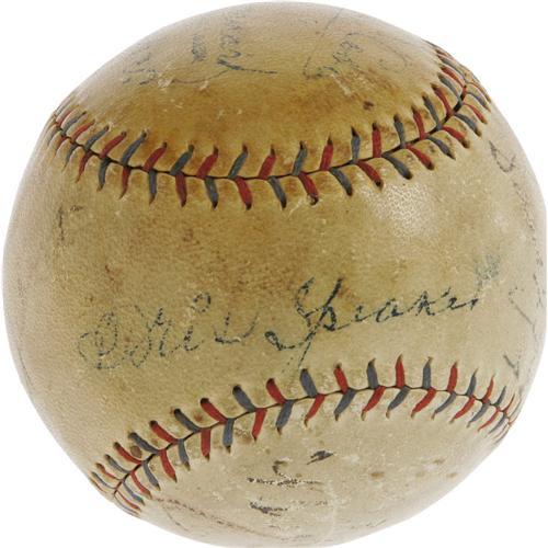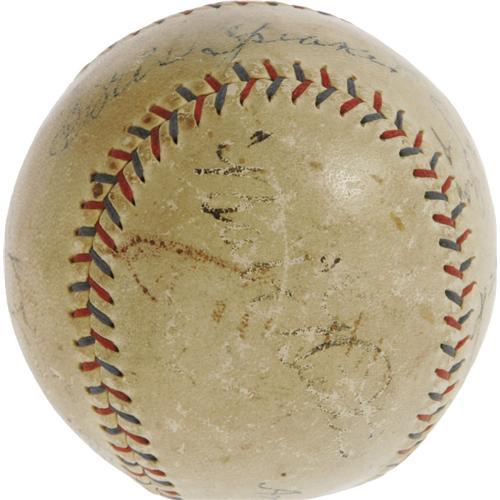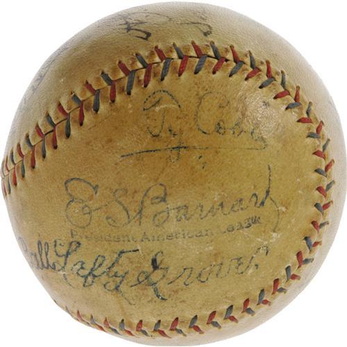 <B>Late 1920's Legends Signed Baseball with Ruth, Gehrig, Cobb, Speaker.</B></I> You couldn't ask for a better cast of characters than that which we find on this OAL (Barnard) baseball, likely signed at a meeting between the New York Yankees and the Philadelphia Athletics. Sam Gray is the only signer lacking a Cooperstown plaque, keeping fine company with Babe Ruth, Lou Gehrig, Ty Cobb, Tris Speaker, Lefty Grove and Herb Pennock. While the passing years have had an effect on these historic playing-days signatures, it must be noted that all remain legible and absolutely unmistakable. Ruth rates lowest at 3/10, with his Yankee partner Gehrig a couple points better at 5/10. Their teammate Pennock rates a nice 7/10, as do Cobb, Grove and Speaker, raising the overall average considerably. Careful curation and storage of this important baseball artifact will ensure that it remains in its present state for future generations of collectors, and that it will continue to increase in value as all pieces blessed by such an array of baseball gods do. <I>LOA from PSA/DNA.</B></I> <BR><BR><B>Important notice:</B> Heritage usually auctions material at the rate of 200-250 lots per hour. On some occasions eBay Live bid software or the Internet may not be able to keep up with the pace of the auction. We recommend placing a realistic absentee bid now as insurance to avoid disappointment. Occasionally the auctioneer may eliminate or reject an eBay Live bid, and the auctioneer may also reopen a lot after the close of the eBay live bidding (usually because we missed an audience bid), and may reject your bid even if it shows you as the winning bidder. By bidding via eBay Live, you agree that Heritage may award the lot to another bidder at its sole discretion under the circumstances described above or any other reasonable circumstances. Since eBay bids are not shown to us until we open the lot on the floor, we treat those bids just like floor bids. In most cases the floor responds before the eBay bid is presented to us, due to Internet lag time, so for consistency we have made it a policy that floor bids are always considered first over tie eBay live bids. Also please note that all Heritage lots purchased through eBay Live carry a 22.5% Buyer's Premium. Please make sure you read the Terms and Conditions before you bid. This lot is being auctioned in conjunction with a live floor auction by Heritage Galleries & Auctioneers. All final auction and invoice information will be supplied by Heritage Galleries & Auctioneers, and all other information should be considered preliminary. Lot:19002 <BR><BR><B>Winning Notification and Billing:</B> After the FINAL session in this auction is complete, Heritage will send e-mail and snail mail invoices. This process normally takes several days. All final auction and invoice information will be supplied by Heritage Galleries & Auctioneers, and all other information should be considered preliminary. <BR><BR>This auction will be conducted on a live auction floor and over the Internet through eBay Live. If you choose to place an absentee bid, please take a moment to <font color='#0000ff'><u><a href='http://pages.ebay.com/liveauctions/help/before/laabsentee.html'>learn how eBay Live absentee bidding works</a></u></font><font color='#000000'>