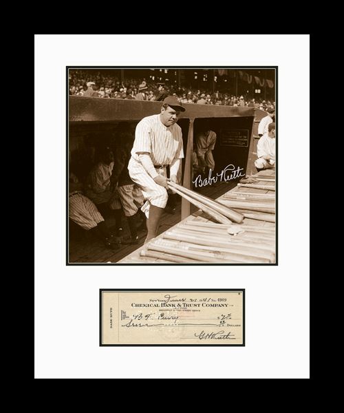 Babe Ruth in Dugout with Check