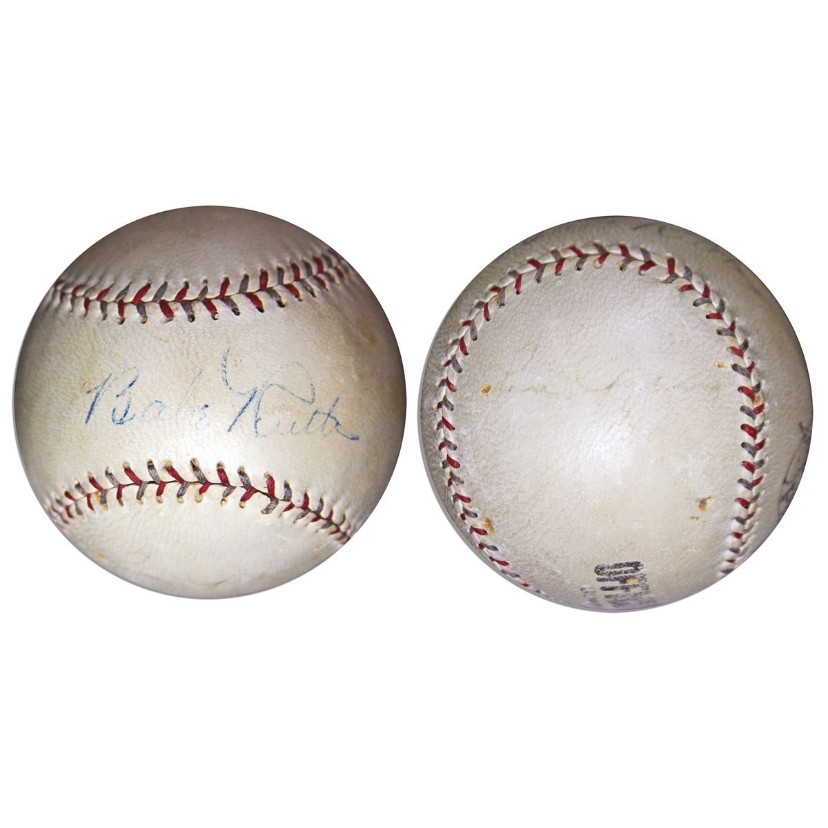Classic baseball signed by legendary Hall of Famers Babe Ruth and Lou Gehrig. Signed on a Phoenix ''Official League'' ball, reportedly after a game at Yankees Stadium. Signed clearly across the sweet spot ''Babe Ruth'' in blue ink. Gehrig's ''Lou Gehrig'' signature is faint, though distinguishable. Ball is generally bright with a few scuffs and marks. Very good condition overall. With PSA/DNA COA for both signatures.
