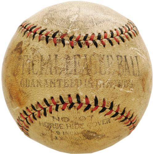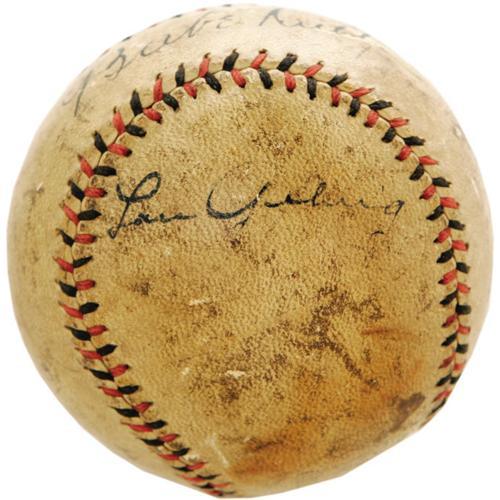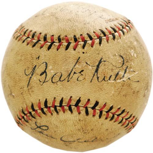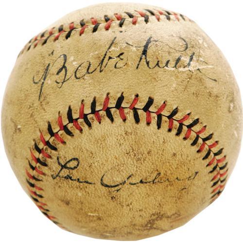 <B>1927 Babe Ruth & Lou Gehrig Signed Baseball.</B></I> Just eight days after this most famous of baseball duos closed out the most remarkable season in history with a four-game sweep of the World Series, Ruth and Gehrig were out on the barnstorming tour with the Bustin' Babes and Larrupin' Lous. At this October 16th stop of the tour, a young fan approached the Home Run King and the American League MVP with an Official League Ball in his hand, which the superstar Yanks graciously signed. The result is one of the most appealing examples of a Ruth/Gehrig ball on the market today, with a vintage notation that definitively links the sphere to the storied baseball year of 1927. Ruth's sweet spot signature is rendered in strong black fountain pen ink, rating a very conservative 8/10 due to minor surface wear. The Gehrig, fortuitously placed so as to provide simultaneous display with the Ruth, rates at worst a half point below. The ball shows even, attractive toning, with a mild degree of surface wear that does very little to hinder visual appeal. A dream piece for the serious baseball autograph collector. <I>LOA from PSA/DNA.</B></I>