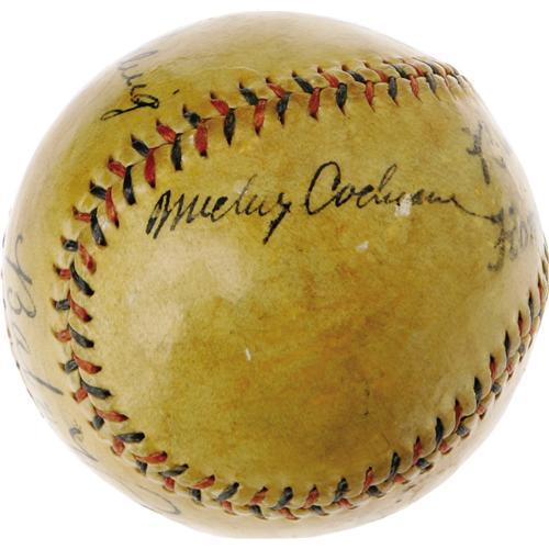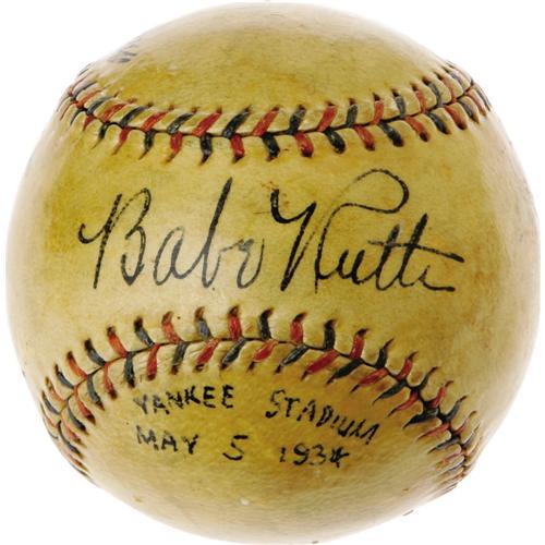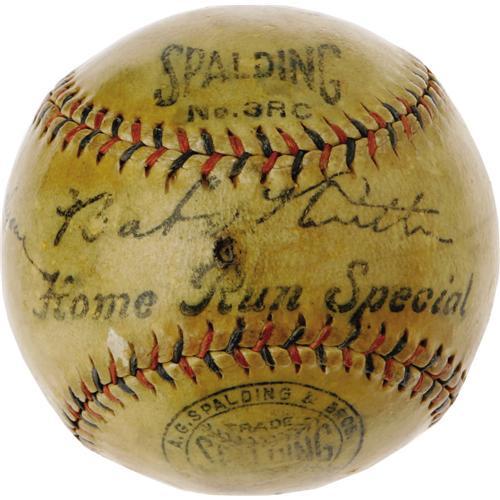 <B>1934 Babe Ruth, Lou Gehrig & Mickey Cochrane Signed Baseball.</B></I> We hate to call the autographs on this remarkable baseball "perfect 10's," as it degrades them to be lumped in with other signatures that have fallen under that heading in the past. These autographs are so much stronger than the "average" 10 that a tongue-in-cheek score of 11 might not be so silly after all. Our catalog imagery should illustrate our point fairly well. Consider the sweet spot Babe Ruth autograph, rendered in the boldest and darkest of black fountain pen ink, unmistakable at fifty feet of distance. Note how perfectly it displays as a single, above the neatly penned notation "Yankee Stadium, May 5, 1934" on the lower panel. Traveling westward, we encounter an equally stunning Gehrig autograph, again displaying as a perfectly convincing single. North of the Babe we find the third Hall of Famer, Tigers great Mickey Cochrane. Yet again the boldest fountain pen ink was used, though a tiny chip in the surname derails what would otherwise be another perfect score. We have been able to determine rather definitively, through the cast of characters and the drilled mounting hole through the "Babe Ruth Home Run Special" stamping, that this lightly shellacked sphere was a gift to a VIP from Christy Walsh, who often mounted autographed balls on ink blotters for presentation. Walsh is recognized as the first sports agent, with his most noteworthy clients being the legendary duo of Ruth and Gehrig. This delectable provenance, and the simply outrageous condition of the baseball's autographs, sets this special artifact in an elite class, worthy of the most esteemed private collections. Finer Ruth and Gehrig autographs on a baseball couldn't possibly exist. <I>LOA from PSA/DNA.</B></I>