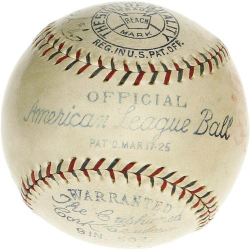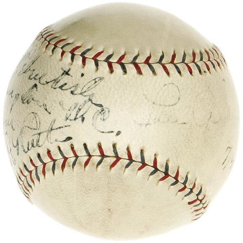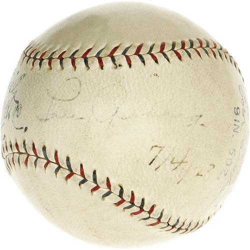 <B>1928 Babe Ruth & Lou Gehrig Signed Baseball.</B></I> Independence Day in our nation's capital, and what could be more American than a visit from the greatest team our National Pastime has ever produced? On a day that the eventual World Champs split a doubleheader with the Senators at Griffith Stadium, the Bambino and the Iron Horse applied their autographs to a clean OAL (Barnard) ball for a patriotic fan. The Babe's lengthy side panel inscription rates a fine 8/10, and reads "To Joseph Rebentisch, Washington D.C., From 'Babe' Ruth." Gehrig simply signs his name in a lighter but still entirely legible 3/10 ink. The date "7/4/28" is penned below Gehrig's signature in an unknown hand. This special sphere from the heyday of Murderer's Row comes to us directly from the Rebentisch family, and is making its first appearance on the hobby stage. <I>LOA from PSA/DNA.</B></I>