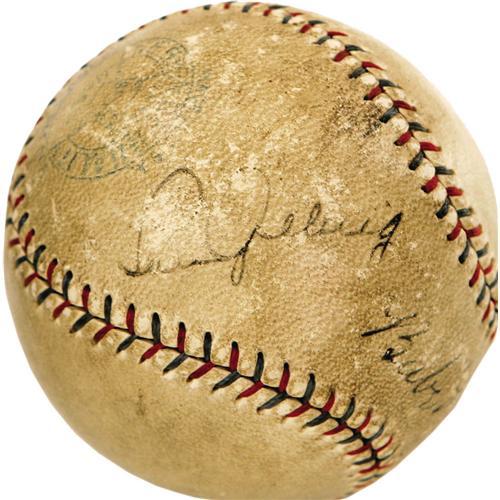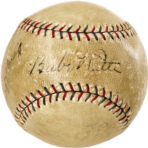 <B>Late 1920's Babe Ruth & Lou Gehrig Signed Baseball.</B></I> This dynamic duo's appearance on an OAL ball from the presidency of Ernest Barnard definitively dates the sphere to the 1927 to 1931 era, a period of great production for the most dangerous sluggers of Murderer's Row. The Babe takes his customary position on the sweet spot between the ball's blue and red stitching, with Gehrig angled just to the left, and close enough to allow for simultaneous display. The ink remains wonderfully bold, with points lost only to the scattered light scuffing that nips at the signatures to mild effect. Our catalog imagery should illustrate that each autograph still presents very nicely. Still to this day perhaps the most noteworthy pair in baseball history. <I>LOA from PSA/DNA.</B></I>