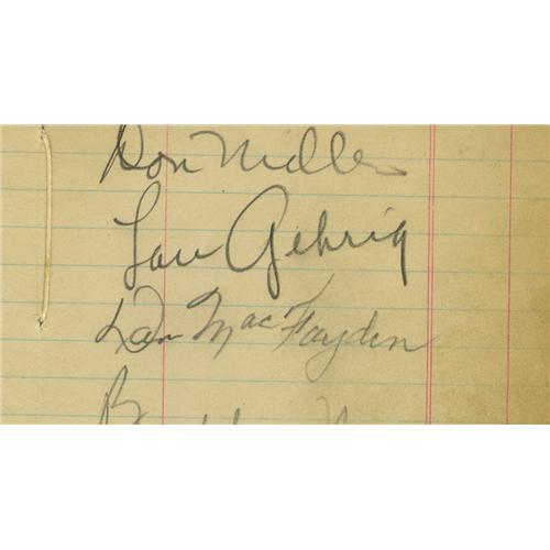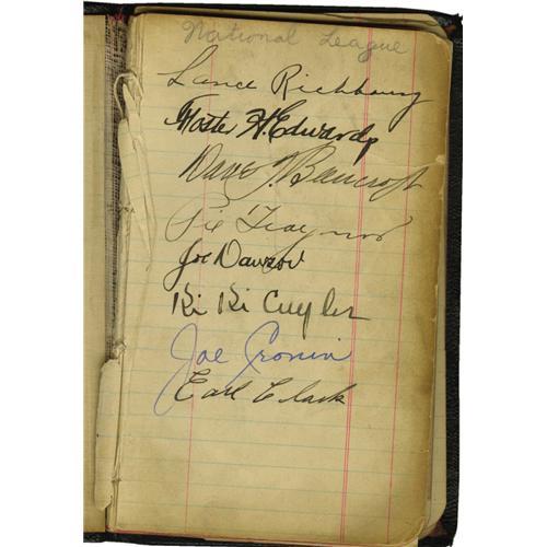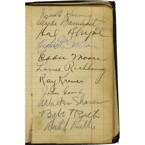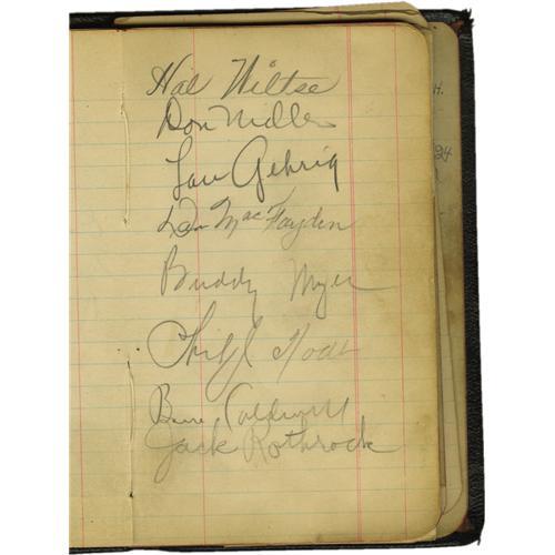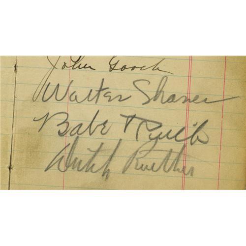<B>1920's Baseball Autograph Book Signed by Ruth, Gehrig & More.</B></I> Charming little book was once the proud possession of a young baseball and ham radio enthusiast in the later years of the 1920's. In a childlike hand he lists all of the stations he has been able to tune in, and a modified box score for a 1927 Red Sox vs. Yankees game he heard on his radio. The opening three pages of the book, however, document a close encounter with many of the stars he followed on the airwaves. Most notable are 10/10 pencil signatures from Babe Ruth and Lou Gehrig, though the first page boasts a tremendous gathering of ink signatures including Dave Bancroft, Pie Traynor, Ki Ki Cuyler and Joe Cronin. The spine of the small leatherbound volume has loosened over time but the pages still remain attached, and while there is toning at the outer edges the autographs themselves are not materially affected. An embodiment of the age of innocence and wonder that was Golden Age baseball. <I>LOA from PSA/DNA.</B></I> <BR><BR><B>Important notice:</B> Heritage usually auctions material at the rate of 200-250 lots per hour. On some occasions eBay Live bid software or the Internet may not be able to keep up with the pace of the auction. We recommend placing a realistic absentee bid now as insurance to avoid disappointment. Occasionally the auctioneer may eliminate or reject an eBay Live bid, and the auctioneer may also reopen a lot after the close of the eBay live bidding (usually because we missed an audience bid), and may reject your bid even if it shows you as the winning bidder. By bidding via eBay Live, you agree that Heritage may award the lot to another bidder at its sole discretion under the circumstances described above or any other reasonable circumstances. Since eBay bids are not shown to us until we open the lot on the floor, we treat those bids just like floor bids. In most cases the floor responds before the eBay bid is presented to us, due to Internet lag time, so for consistency we have made it a policy that floor bids are always considered first over tie eBay live bids. Also please note that all Heritage lots purchased through eBay Live carry a 22.5% Buyer's Premium. Please make sure you read the Terms and Conditions before you bid. This lot is being auctioned in conjunction with a live floor auction by Heritage Galleries & Auctioneers. All final auction and invoice information will be supplied by Heritage Galleries & Auctioneers, and all other information should be considered preliminary. Lot:19053 <BR><BR><B>Winning Notification and Billing:</B> After the FINAL session in this auction is complete, Heritage will send e-mail and snail mail invoices. This process normally takes several days. All final auction and invoice information will be supplied by Heritage Galleries & Auctioneers, and all other information should be considered preliminary. <BR><BR>This auction will be conducted on a live auction floor and over the Internet through eBay Live. If you choose to place an absentee bid, please take a moment to <font color='#0000ff'><u><a href='http://pages.ebay.com/liveauctions/help/before/laabsentee.html'>learn how eBay Live absentee bidding works</a></u></font><font color='#000000'>