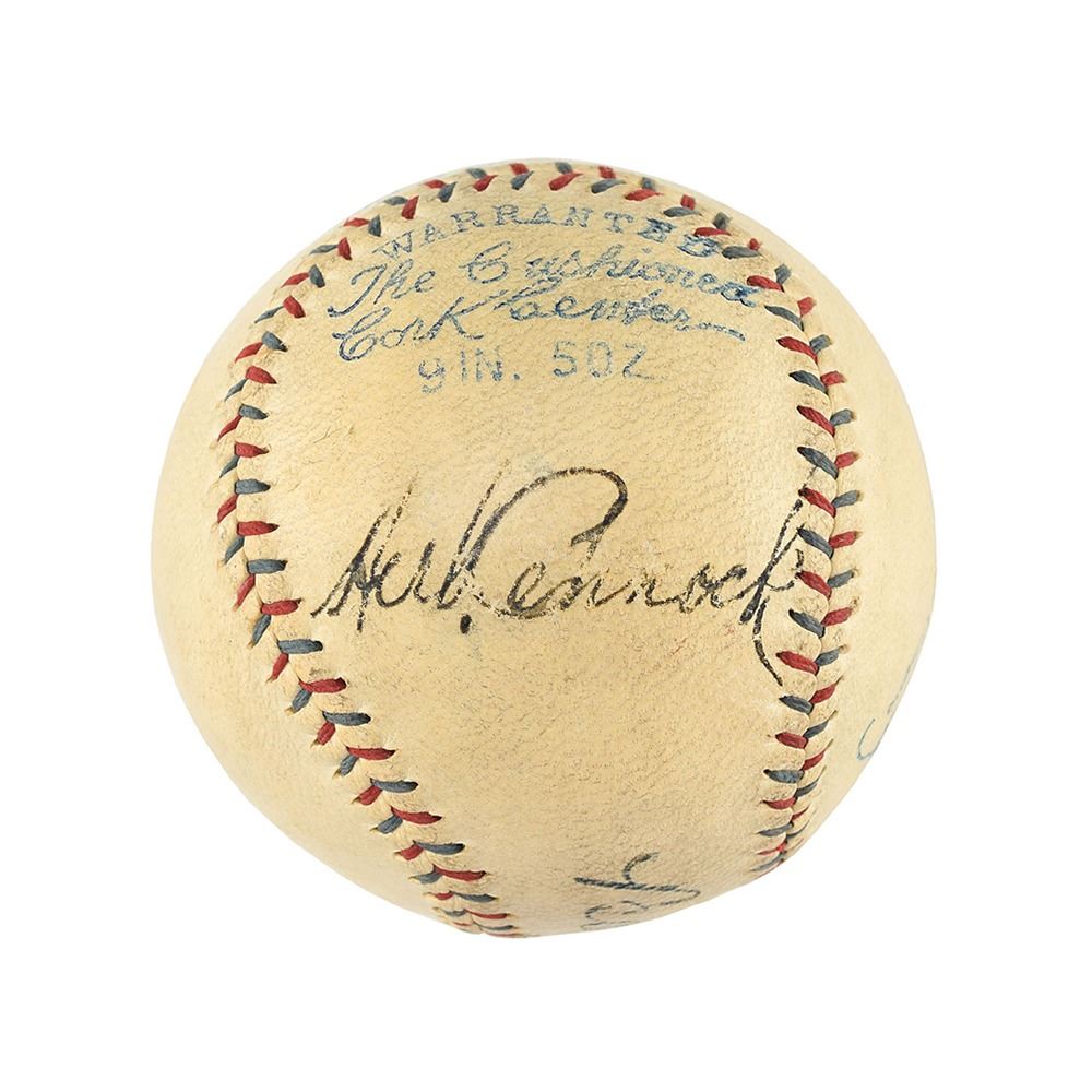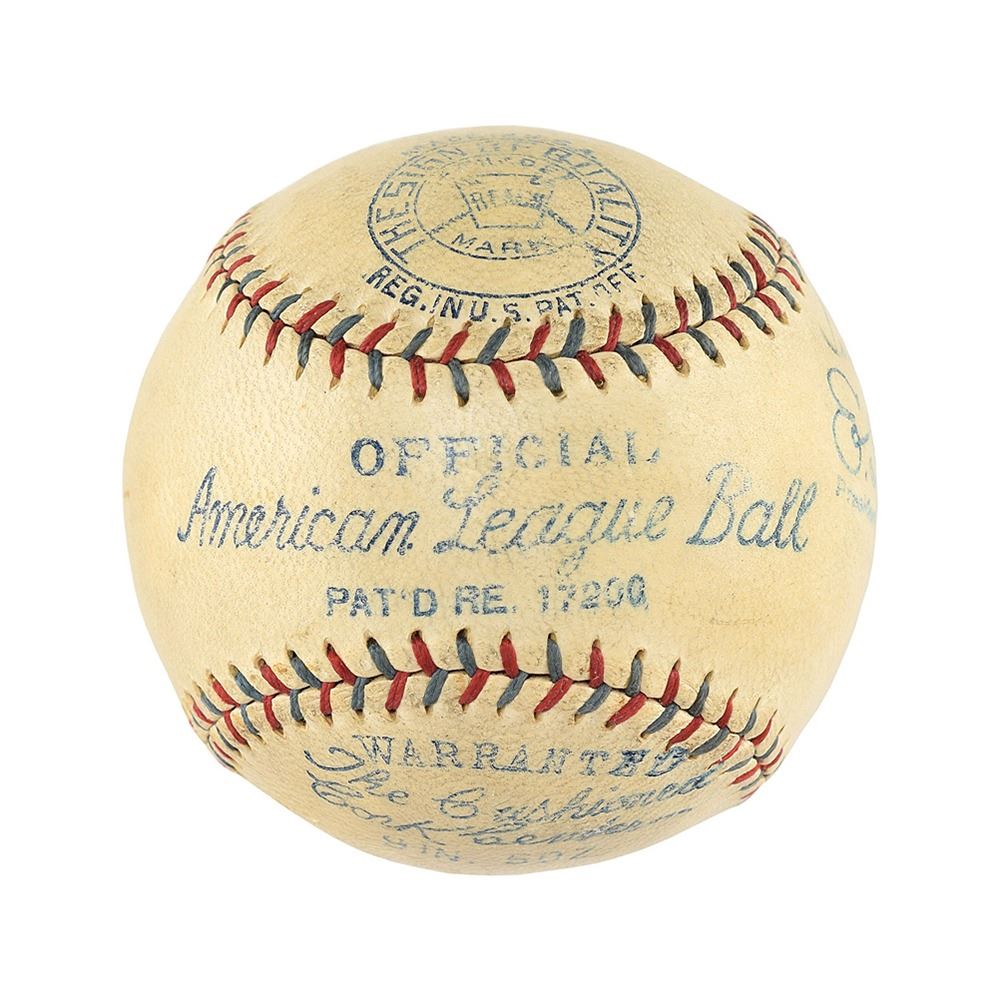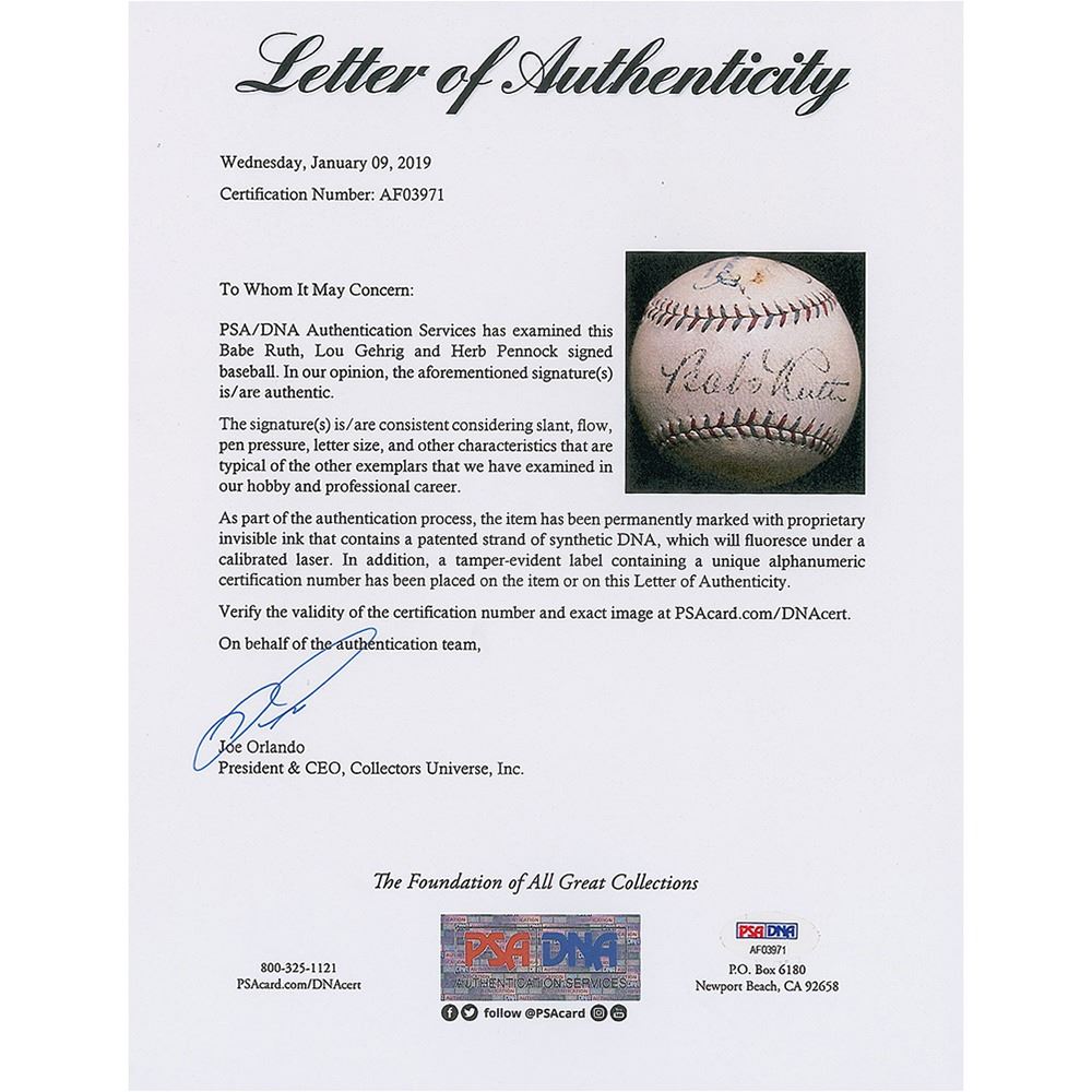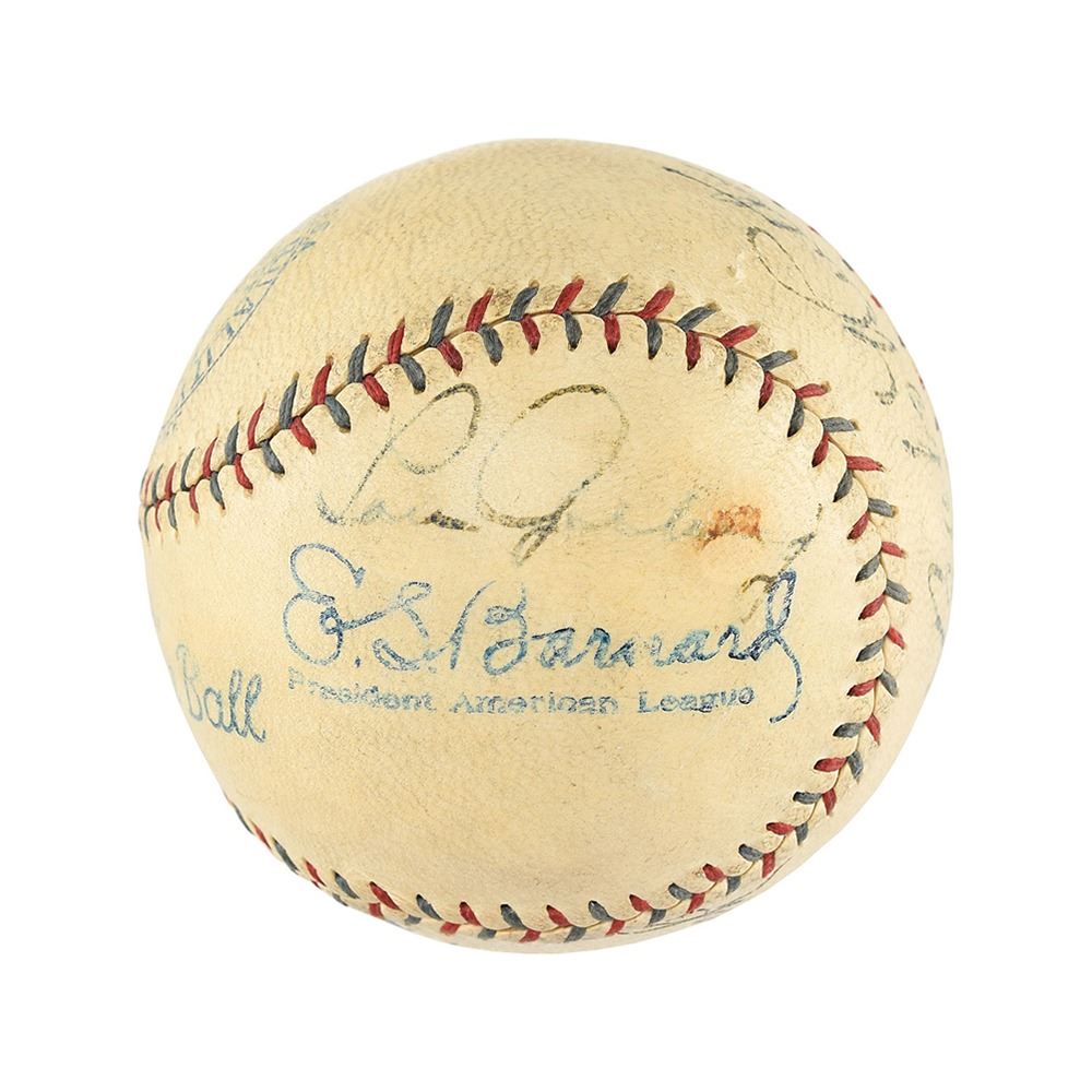 Official American League (Barnard) baseball is boldly signed by Babe Ruth ("7/10") on the sweet spot. Lou Gehrig has signed a side panel, just above American League President E. S. Barnard's facsimile signature. The large strong Gehrig signature has a small brown stain which slightly obscures the "ri" in "Gehrig," otherwise signature grades ("5/10"). Herb Pennock ("7/10") has signed a side panel in black ink. Ruth, Gehrig, and Pennock, each a Hall of Famer, are the only signatures on the ball. The ball has some light soiling and is overall in excellent condition. A trio of New York Yankees greats who helped the franchise to their first four World Series titles.