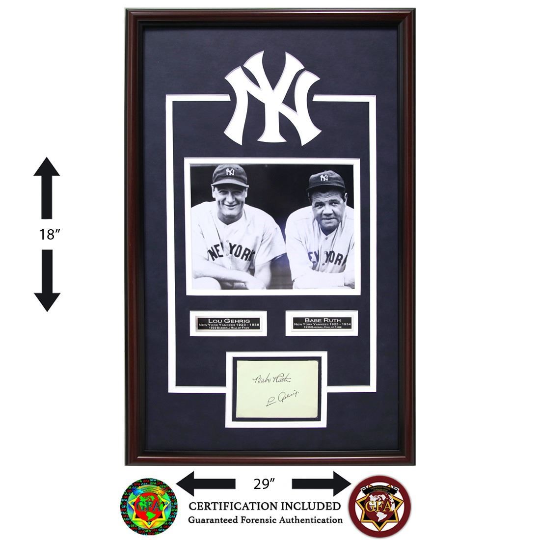 Babe Ruth (1895-1948) and Lou Gehrig (1903-1941) signed 3 ¼ X 5 ½ cut. Both signatures are boldly signed in black ink. Babe Ruth and Lou Gehrig had a unique relationship that cumulated at this moment described by the New York Herald Tribune, “Gehrig evoked tears and laughter with words which made the previous speeches sound rather hollow. He was wonderful. Somehow, he managed to control his voice. And when he was through, Ruth put his arm around him... People were crying in the stands when Gehrig finished. And they were ready to laugh again when Ruth put his arms around Gehrig and advised him to try out the fishing rod that had been given him and catch all the fish in the sea. Professionally custom Matted and Framed. Comes with a Letter of Authentication from Guaranteed Forensic Authenticators (GFA), along with the GFA guarantee of authenticity.