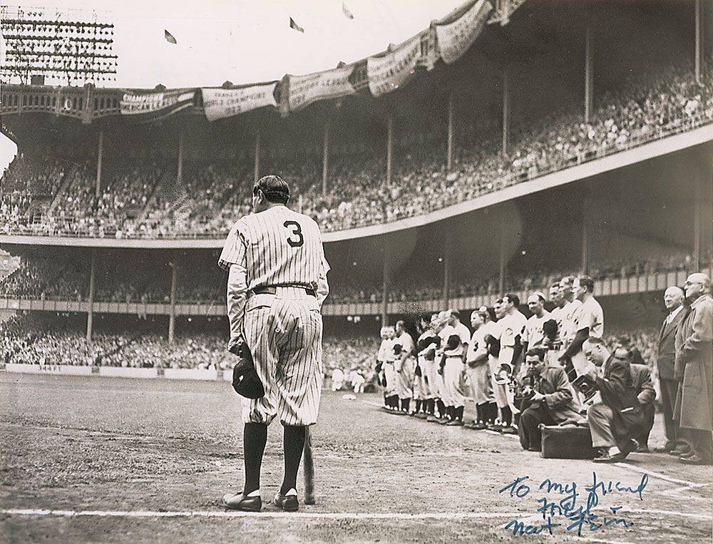 Iconic satin-finish 9.75 x 7.5 photo of Fein’s ‘The Babe Bows Out,’ signed and inscribed in black felt tip, “To my friend Fred, Nat Fein.” On the reverse, Fein has added, “The Babe Bows Out / Pulitzer Prize 1949.” In fine condition, with slightly trimmed edges. Accompanied by a full letter of authenticity from JSA, as well as the hard-to-find original program from the day it was taken, June 13, 1948, when Ruth’s number was retired by the New York Yankees; the scorecard inside was filled out in pencil by a spectator. Fein was awarded the 1949 Pulitzer Prize for the photograph, which has become one of the sports world’s most well-known and recognizable images.