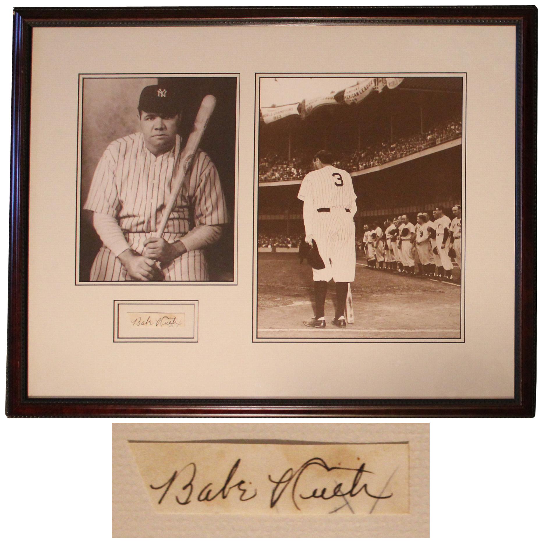 Signature of ''Babe Ruth'' in black ink on a 2.75'' x .75'' piece of paper. Signature is framed to an overall size of 25'' x 20.5'' with two photos of the legendary player posing in his Yankees uniform. Signature is closely clipped and has minor foxing and toning, else very good. With JSA COA.
