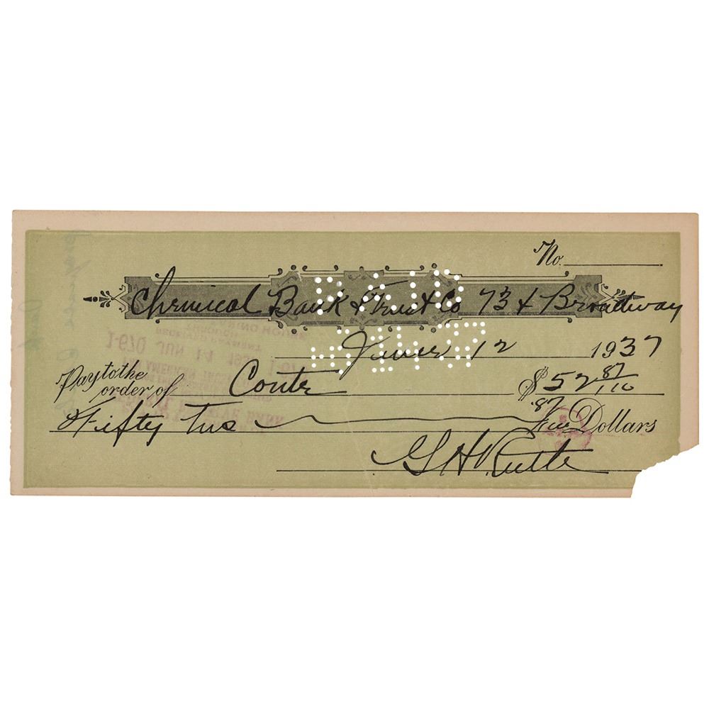 Chemical Bank & Trust Co. check, 8.25 x 3.5, filled out and signed by Babe Ruth, "G. H. Ruth," payable to Conte for $52.87, June 12, 1937. In very good to fine condition, with loss to the lower right corner, and an unobtrusive vertical tear repaired with tape on the reverse.