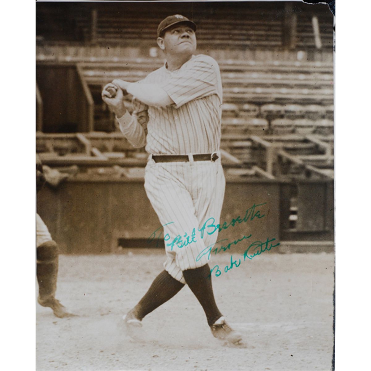 Fantastic signed photo of Babe Ruth in his Yankee pinstripes, looking far into the sky after hitting a baseball. 7.75'' x 9.5'' photo features a perfect signature, inscribed ''To Bill Bissette, From Babe Ruth'' in bright blue-green ink. With ''Pacific & Atlantic Photos, Inc.'' stamped on the verso. Some smudging to inscription though Ruth's signature remains fine. Photo has a chip to upper right corner and trimmed margins; overall in very good condition. Accompanied by PSA/DNA COA.