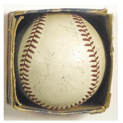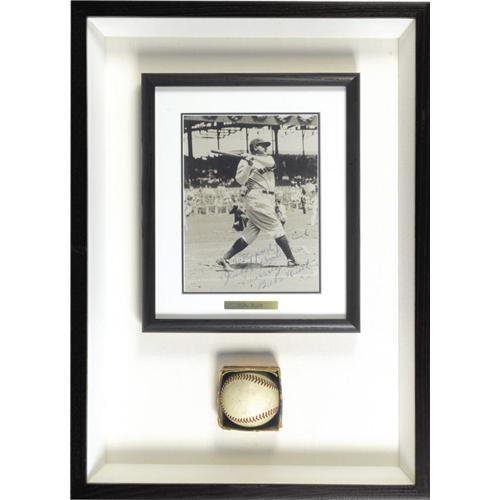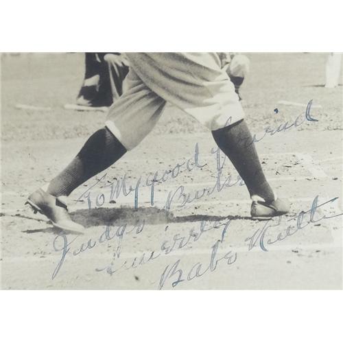 <B>1930's Babe Ruth Signed Photograph & Single Signed Baseball.</B></I> Pair of autographed pieces from the game's greatest star were signed to Judge Richard Burke and consigned to Heritage by Burke's son, who had the ball and photo beautiful mounted in a shadow box for display. The photo measures 6.5x8" in size and captures the Bambino in the follow through of his home run swing. Blue fountain pen ink spells, "To My good friend Judge Burke, Sincerely Babe Ruth." The inscription and signature project at an impressive 8.5/10, and the photo shows no signs of damage or wear. The Official National League ball mounted just below, still in its original box, reads simply, "To Dick, from Babe Ruth" at a boldness of 5/10. We have not removed the ball from the display to examine it in its entirety, but the portion that is visible shows no staining or damage of any sort. Together the pieces form an impressive display, measuring 17x23" in its shadow box frame. <I>LOA from PSA/DNA.</B></I>