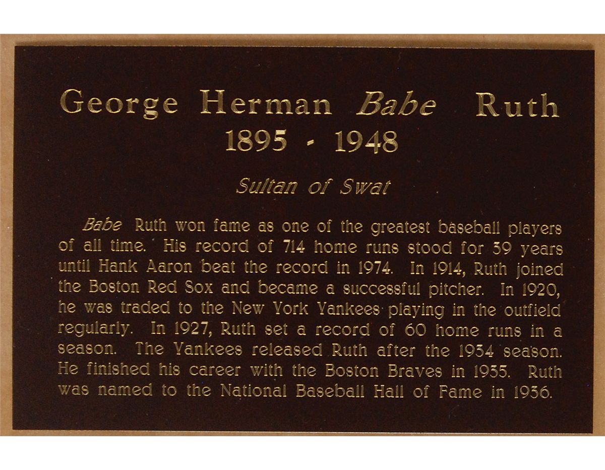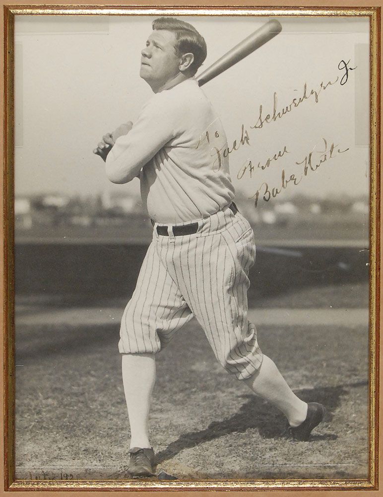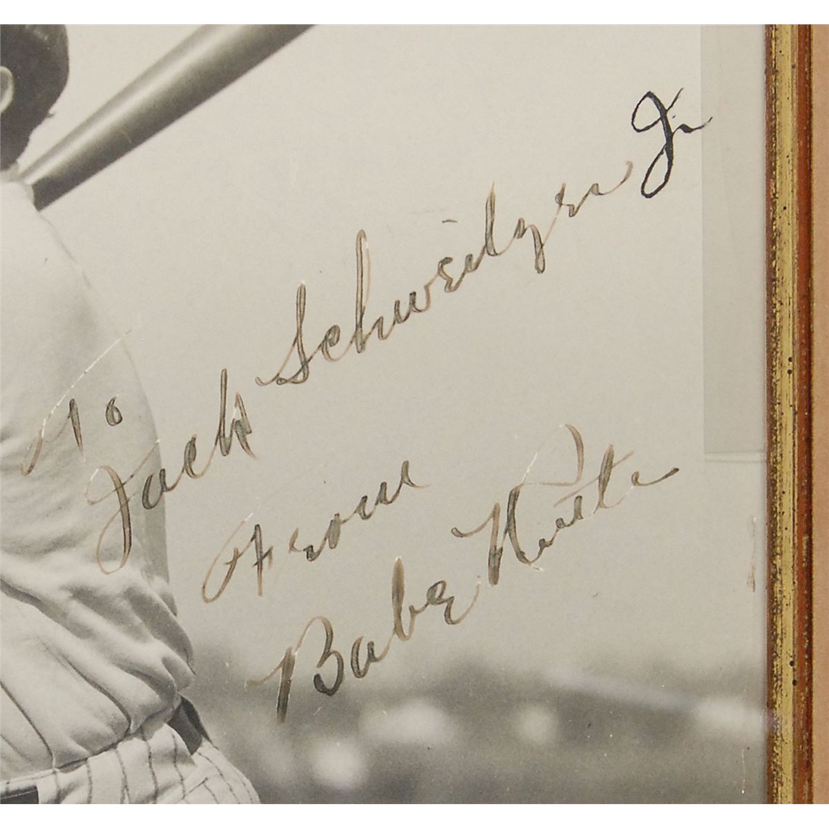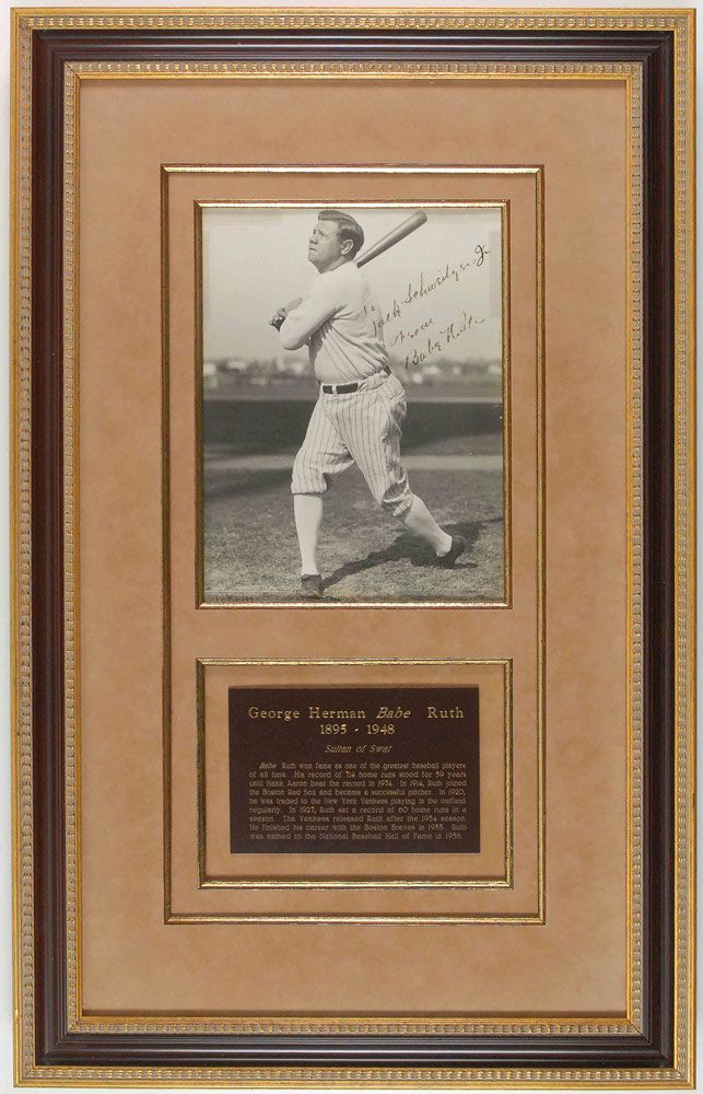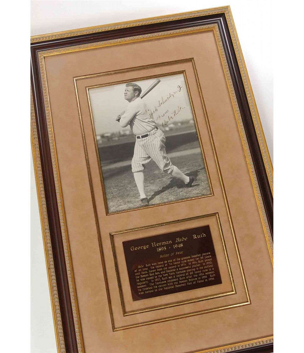 Classic glossy 7 x 9 photo of the ‘Sultan of Swat’ taking a practice swing in a white shirt and his Yankee pinstripe pants, signed and inscribed in fountain pen, “To Jack Schweitzer Jr., From Babe Ruth.” Archivally double-suede-matted and framed with a biographical plaque to an overall size of 16 x 25. A notation to the lower left dates the photo to July 1928. In very good condition, with scattered creases, some slight tears and small areas of paper loss to edges, and a bit of flaking to ink in inscription and signature. A classic pose of the Babe in his iconic pinstripes.