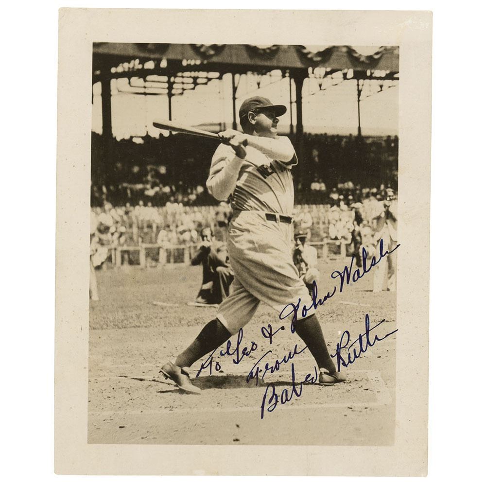 Desirable vintage pearl-finish 8 x 10 full-length photo of the legendary ballplayer taking a swing in his New York Yankees uniform, signed and inscribed in dark fountain pen, "To Leo & John Walsh, from, Babe Ruth.†In fine condition, with a short vertical crease to the bottom edge and light silvering to darker areas of the image. Accompanied by full letters of authenticity from JSA and PSA/DNA. An attractive 'post-swing' portrait of Ruth highlighted by an uncommonly bold autograph.