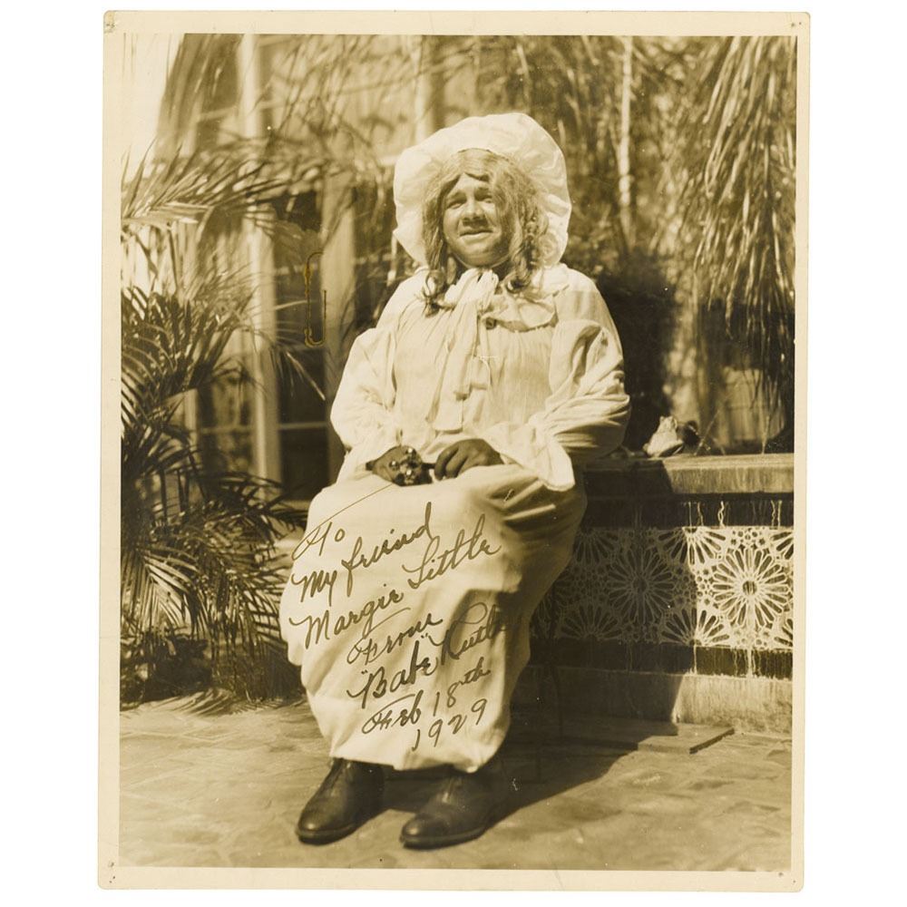 Humorous vintage glossy 8 x 10 full-length photo of the legendary ballplayer wearing golden tresses and an oversized baby gown, signed and inscribed in fountain pen, "To my friend Margie Little, from, 'Babe' Ruth, Feb. 18th, 1929.†In very good to fine condition, with a rusty paperclip impression to the left of Ruth's image, tack holes to the corners, scattered light creasing, and light silvering to the darker areas of the photo.