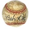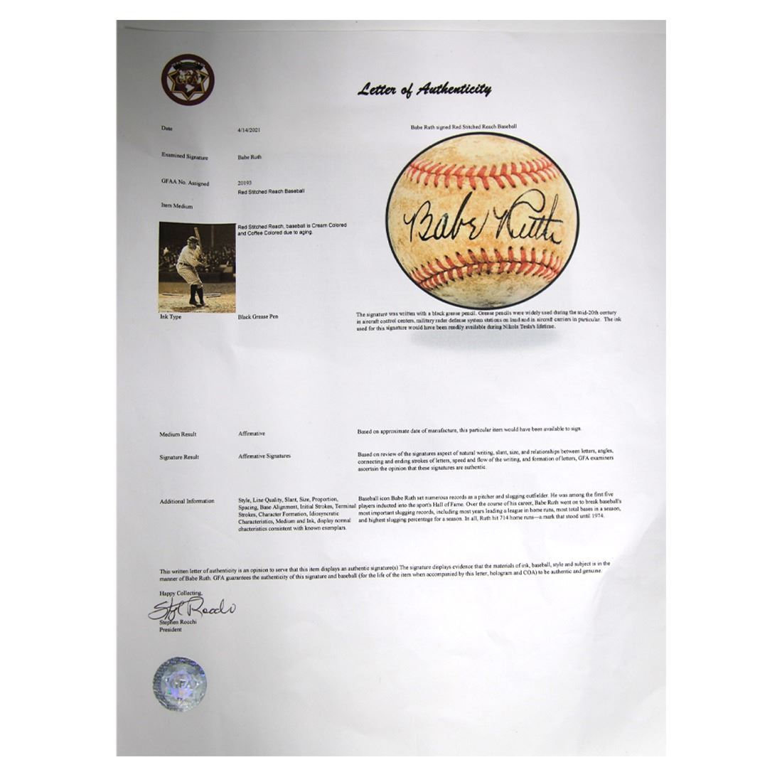 Babe Ruth (February 6, 1895–August 16, 1948) Babe Ruth signature Boldly signed in black ink across the sweet spot. This Reach Black and Red Stitched Baseball shows signs of aging and is tobacco and coffee colored. The baseball has lost all significant manufacturer markings because of age. There was no other athlete in the world more popular during the 1920’s. 30’s and 40’s than that of Babe Ruth. He generously signed and gifted baseballs, he wasn’t just the Home Run King, he was also a thoughtful and kindhearted autograph signer. The Babe left his mark on the game of baseball with his bat, glove and pen. Comes with a Letter of Authentication from Guaranteed Forensic Authenticators (GFA), along with the GFA guarantee of authenticity.