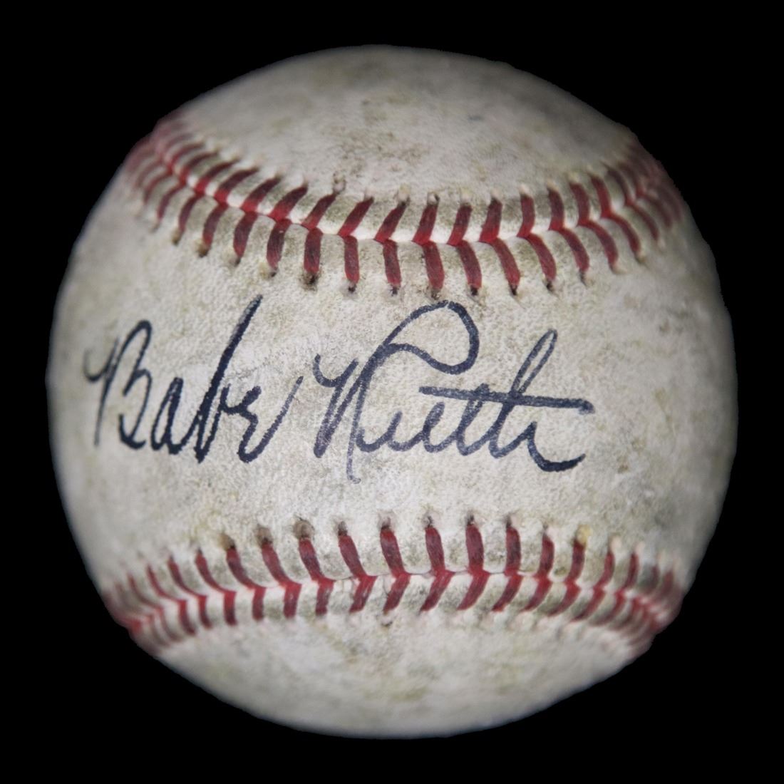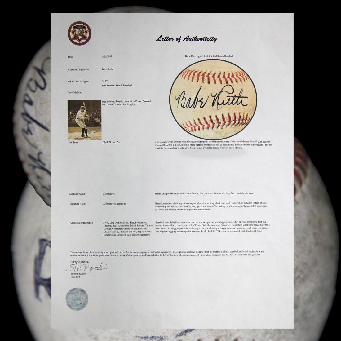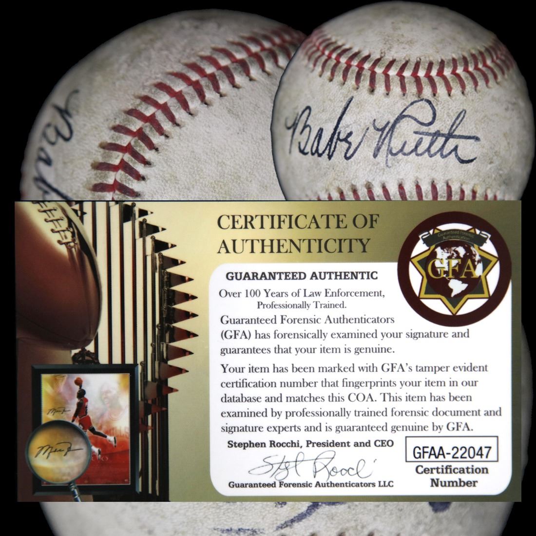 Babe Ruth (February 6, 1895–August 16, 1948) Babe Ruth signature boldy signed in black ink across the sweet spot. This Red Stitched Baseballshows signs of aging and is cream and coffed colored. The Amateur League baseball is signed by Ruth in bold black fountain pen. At the center of all sports collectibles there is the single signed Babe Ruth baseball across the sweet spot. There was no other athlete in the world more popular during the 1920’s, 30’s and 40’s than Babe Ruth. He generously signed and gifted baseballs, he wasn’t just the Home Run King, he was also a thoughtful and kind hearted autograph signer. The Babe left his mark on the game of baseball with his bat, glove and pen. Ball is encased in a high clarity clear plastic cube with a built in cradle to keep your ball centered. Comes with a Letter of Authenticity from Guaranteed Forensic Authenticators (GFA), along with the GFA guarantee of authenticity.