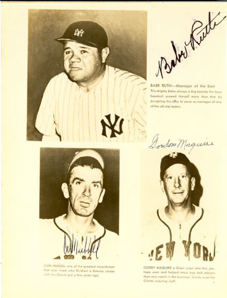 Behold these photos of Babe Ruth, Carl Hubbell and Gordy Maguire, all of whom managed and coached the 1945 All-American East baseball team and all of whom have signed this photo. On the back of the photo is stamped: "Autographs, Team Mates and Sports Editors" and "All American Boys Baseball Game August 28, Polo Grounds, New York." The photo has some staining on the back but the front is in EX-MT condition. The Babe Ruth signature is very bold thanks to black fountain ink but is slightly smudged. The other two signatures rate 8/10. This is a rare and combination of signed photos.