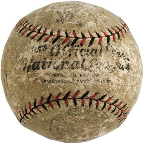 <B>Circa 1920 "Babe" Ruth Single Signed Baseball.</B></I> While we can't be entirely certain of the year that the Babe applied his signature to this important orb, we can make a strong assumption that the month was October. The "Official National League" stamping opposite Ruth's signature leaves little doubt of this fact, as the Babe would have had little contact with balls from the Senior Circuit except in World Series matches. Such a revelation then allows our minds to wander--could it have been signed in 1916, the day of his fourteen-inning shutout of the Brooklyn Robins? Or does it date to his Game One shutout in the 1918 Fall Classic? Unfortunately the wear to the leather of the ball's surface has eliminated the vestiges of the League President stamping to assist with dating the ball itself, but the ball definitely was issued previous to 1926. That in itself makes this a particularly unique and desirable Ruth single. But thankfully the autograph itself has survived in far better condition than the presidential stamping, remaining entirely legible and unmistakable on the dappled sweet spot. While certainly not a pristine autograph, its importance as one of the earliest on the market, and as one boasting Championship vintage, cannot be understated. <I>LOA from PSA/DNA.</B></I>