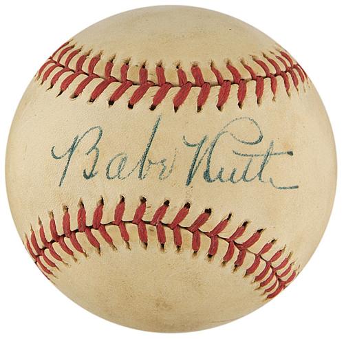 Classic Babe Ruth single-signed official American League baseball. This vintage red-stitched baseball has an extraordinary high-grade Ruth signature that sits upon the sweet spot. Ruth has boldly signed the ball in blue ink, ''Babe Ruth'' with the signature grading ''9.'' With an official American League ''Reach'' stamping on the panel below the ball label, the design of which was used on official balls between the years 1934 and 1945. Minor rubbing, else near fine condition. With COA from James Spence/JSA.