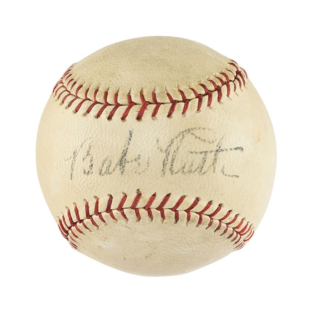 One of the pinnacles in the entire hobby is a Babe Ruth single-signed baseball. And if Babe Ruth excelled at anything better than home runs, it was signing baseballs. There is no other item that universally inspires recognition and interest than a single-signed Ruth baseball. Although others had selected the sweet spot on which to inscribe their autographs, it was the 'Babe' who established this narrow leather isthmus as the most desirable location for a signature. This is a simply outstanding example of a Ruth masterpiece, an "Amateur League" ball that has been signed magnificently in fountain pen on the sweet spot. The lightly soiled, creamy-toned EX-MT condition ball has a gorgeous "Babe Ruth" signature averaging ("6/10"). The instant centerpiece to any baseball memorabilia collection.