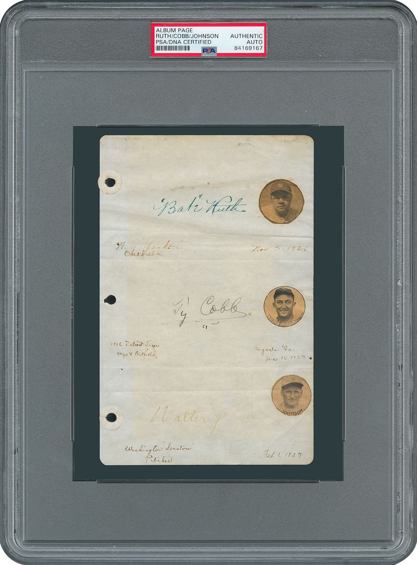 Truly remarkable set of vintage fountain pen signatures, "'Babe' Ruth," "Ty Cobb," and "Walter Johnson," on an off-white 5 x 7.75 album page bearing small affixed images of each Hall of Fame ballplayer; collector's notations date the Ruth signature to November 5, 1926, the Cobb signature to January 15, 1927, and the Johnson signature to February 1, 1927. In very good to fine condition, with several horizontal folds, light toning and wrinkling, and Johnson's last name very light but mostly legible. Accompanied by full letters of authenticity from JSA and PSA/DNA. Encapsulated in a PSA/DNA authentication holder.
