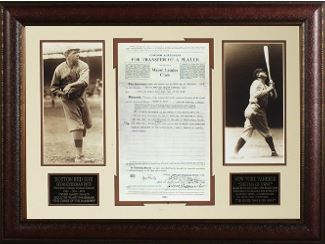 The Curse of the Bambino was a superstition evolving from the failure of the Boston Red Sox baseball team to win the World Series in the 86-year period from 1918 to 2004. While some fans took the curse seriously, most used the expression in a tongue-in-cheek manner. The curse was said to have begun after the Red Sox sold Babe Ruth, sometimes called The Bambino, to the New York Yankees in the off-season of 1919-1920. Before that point, the Red Sox had been one of the most successful professional baseball franchises, winning the first World Series and amassing five World Series titles. After the sale they went without a title for decades, as the previously lackluster Yankees became one of the most successful franchises in North American professional sports. The curse became a focal point of the Yankees–Red Sox rivalry over the years. Talk of the curse as an ongoing phenomenon ended in 2004, when the Red Sox came back from a 0-3 best-of-seven deficit to beat the Yankees in the 2004 American League Championship Series and then went on to sweep the St. Louis Cardinals to win the 2004 World Series. This is a 2 Photo Babe Ruth Boston Red Sox and New York Yankees 34x21 with Replica Transfer Player Contract. Custom Matted and Leather Framed as shown.