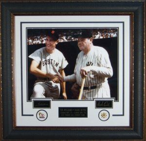 Babe Ruth was one of the league's most prolific hitters. Ruth was a mainstay in the Yankees' lineup that won seven pennants and four World Series titles during his tenure with the team. In 1936, Ruth became one of the first five players elected to the Baseball Hall of Fame. Ted Williams played 21 seasons with the Boston Red Sox, twice interrupted by military service as a Marine Corps pilot. Nicknamed The Kid, the Splendid Splinter, Teddy Ballgame, and The Thumper, he is widely considered one of the greatest hitters ever. Williams was a two-time American League Most Valuable Player (MVP) winner, led the league in batting six times, and won the Triple Crown twice. He had a career batting average of .344, with 521 home runs, and was inducted into the Baseball Hall of Fame in 1966. This is a Babe Ruth and Ted Williams custom premium framed unautographed Signature Engraved oversize 27x39 piece. FEATURING THE ENGRAVED SIGNATURES OF Hall of famers Babe "Bambino" Ruth and Ted "The Splendid Splinter" Williams.