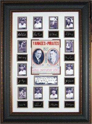 This is the 1927 NY Yankees vs Pittsburgh Pirates Laser Engraved Signature Display featuring the Laser Engraved Signatures of the 1927 New York Yankees including the greats Lou Gehrig, Babe Ruth, and Manager Miller Huggins with Premium Leather Framing to 27x39. In the 1927 World Series, the New York Yankees swept the Pittsburgh Pirates in four games. This was the first sweep of a National League team by an American League team. This magnificent display captures the 1927 historic World Series event and brings it home to you.