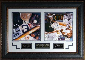 Lou Gehrig played 17 seasons in Major League Baseball for the New York Yankees. Gehrig set several major league records, including the most career grand slams, which Alex Rodriguez tied in 2012, and most consecutive games played (2,130), since surpassed by Cal Ripken, Jr.. Babe Ruth was one of the league's most prolific hitters. Ruth was a mainstay in the Yankees' lineup that won seven pennants and four World Series titles during his tenure with the team. In 1936, Ruth became one of the first five players elected to the Baseball Hall of Fame. This is a New York Yankees Legends Lou Gehrig and Babe Ruth Photos Custom Leather Framed as shown to Approx size of 35x28. Framed with Engraved Replica Signatures of both Yankees.
