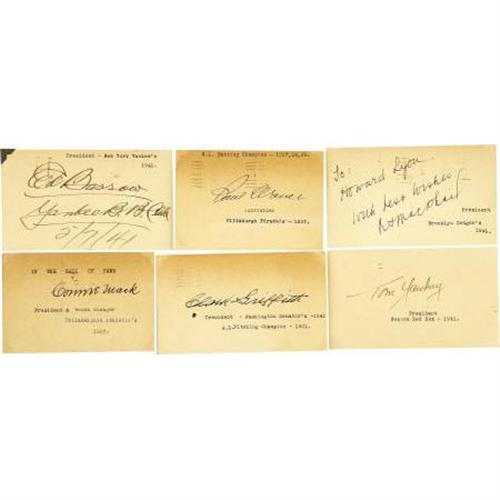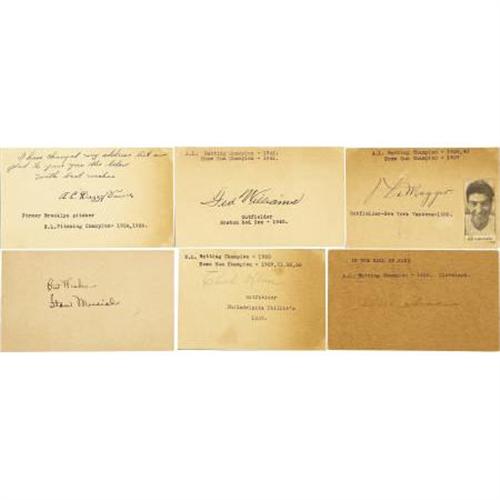 <B>1930's-40's Major League Baseball Players Signed Government Postcards Lot of 249 with Ruth, Wagner, Walter Johnson.</B></I> Perhaps the finest vintage collection of autographed government postcards we've ever encountered, this thrilling grouping is offered for the first time to the collecting hobby, having been consigned to us by the elderly gentleman who personally collected them seven decades ago. While the very finest specimens from this collection are being offered as individual lots within this auction, there is still absolutely no shortage of magnificent specimens within this massive lot. There is far too much to list or image within the pages of this catalog, so we strongly recommend that interested parties visit our offices to peruse the collection personally if at all possible. Unless otherwise noted, all autographs appear in 9/10 or better blue ink, with the mailed postcards toned with age but otherwise free of any concerning defects.<BR><BR>Highlights: Ruth (2/10), Wagner, Walter Johnson, Lazzeri (postcard slightly trimmed), Ted Williams, Speaker (3/10), Mack (2/10), Vaughan, Vance, Musial, Manush, Barrow, Ruffing, Gomez, Joe DiMaggio, Hoyt, Rizzuto, Ernie Bonham (tough, d. 1949), McCarthy, Mack, Simmons, Harry Davis (d. 1947), Lyons, Griffith, Harris, Rick Ferrell, Appling, Walsh, Greenberg, Gehringer, Goslin (7/10 pencil), Eric McNair (d. 1949), Cochrane, Feller (signed in 1937), 1939 Indians with 14 including Feller, 1941 Indians with 16 including Boudreau, Boudreau (8/10), Jim Bagby Jr. (tough, d. 1954), Landis, Harridge, Frick, MacPhail Sr., Reese (2 different), Herman, Wheat, Medwick, Grimes, Klein, Stengel, Averill, Paul Waner, Dizzy Dean, Dahlgren, Root, Mize, Southworth, Slaughter (2 different), Haines, Martin, McKechnie, Lombardi, Lloyd Waner, Vander Meer, Luque, Roush, Kelly, Hubbell, Terry, Hartnett (9/10 pencil), Frisch, Lopez, 1942 White Sox with 13 including Appling, Ruffing, Red Barber, Hafey and many, many more.<BR><BR>Turn of the century names are here, as are various All-Stars and borderline Hall of Famers. All postcards have typed identifiers on them, showing just how serious young Howard Lyon was with his hobby. Included is the large leatherbound scrapbook in which the vast majority of the postcards still reside, held with corners rather than glue so that removal will be simple and danger-free. Exceptional break down value here, though the collection is so appealing in its entirety that the true baseball historian may wish to preserve it as a whole. A prewar autograph collector's dream lot. <I>LOA from PSA/DNA. LOA from James Spence Authentication.</B></I><BR><BR><b>Shipping:</b> Books & Catalogs (<a target="_blank" href="http://www.heritageauctions.com/common/shipping.php">view shipping information</a>)