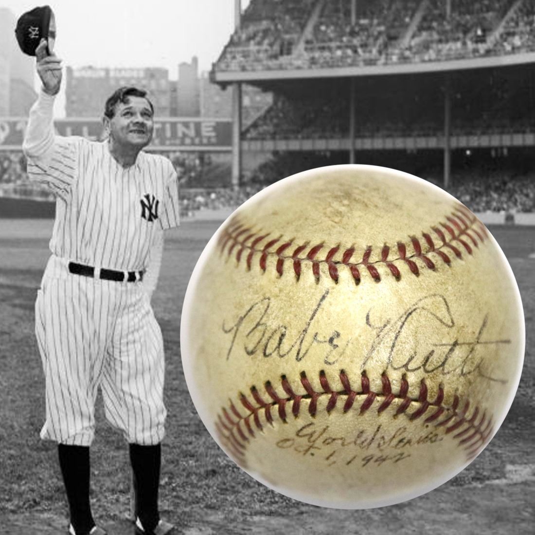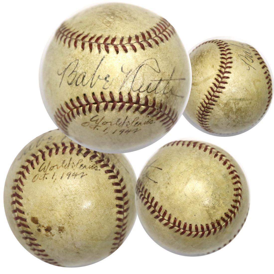 Babe Ruth (February 6, 1895 – August 16, 1948) signed red stitched World Series baseball, with inscription, ‘World Series Oct.1, 1942.’ The Bambino's black fountain pen ink signature occupies the sweet spot with boldness. The fact that the autograph is bolder at the start than the finish, most likely the result of a depleted ink supply. The ball is non-official, but its red stitching effectively mimics Official spheres of the Babe's playing days. Furthermore, the ball has aged to a light tobacco tone. One of the sweetest signatures in the hobby. Comes with a Letter of Authentication from Guaranteed Forensic Authenticators (GFA), along with the GFA guarantee of authenticity.