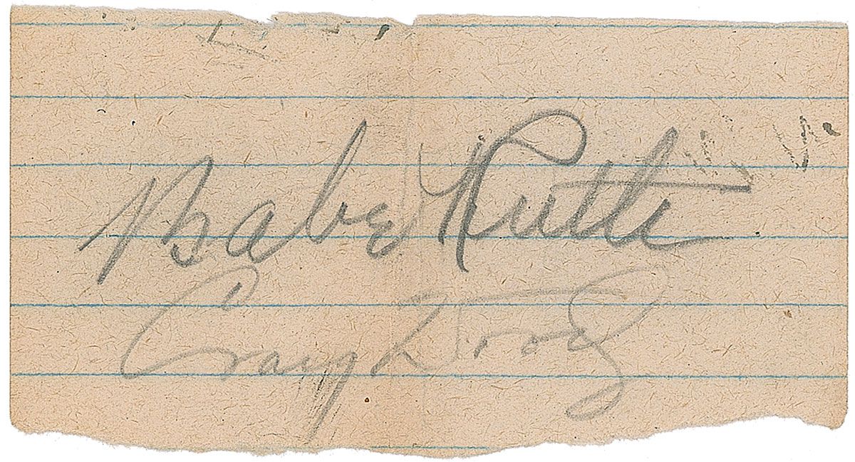 Vintage pencil signatures, “Babe Ruth” and “Craig Wood,” on an off-white 3 x 1.5 lined slip. In very good condition, with central vertical creases passing through the last letter of Ruth’s first name and first letter of Wood’s last name. Consignor notes that this was acquired at a 1942 Army-Navy relief golfing event in Bloomfield, New Jersey.
