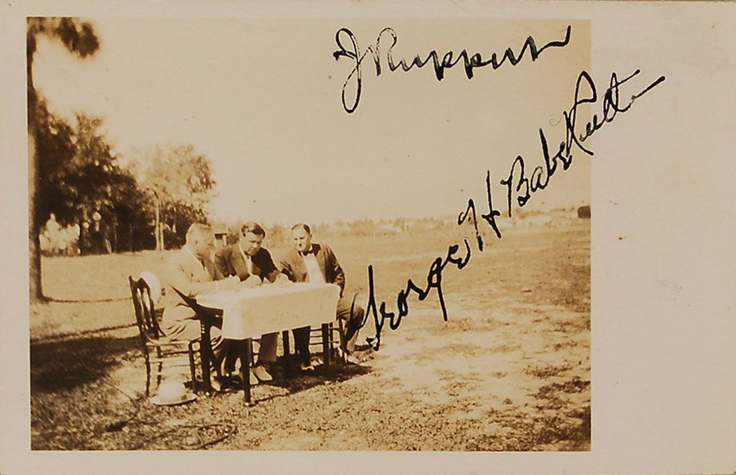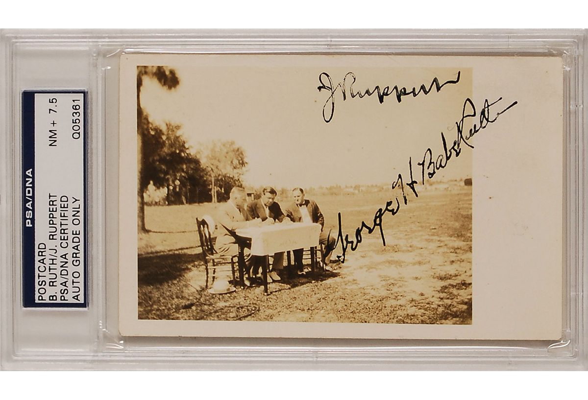 Exquisite vintage 5.5 x 3.5 real photo postcard, signed in fountain pen, “George H. Babe Ruth” and “J. Ruppert.” Original collector’s note to the reverse reads, in part: “I obtained these autographs on March 20, 1934 at the Braves Waterfront Park winter quarters. Babe Ruth was just returning to his playing position left field, for the Yanks & I ran out on the field & asked him to sign this. Just after he was taken out of the game because many more autograph seekers collected near by.” Encapsulated in a plastic PSA/DNA authentication holder, and accompanied by a full PSA/DNA letter of authenticity grading the Ruth autograph an 8 and the Ruppert a 7. Some trivial foxing and silvering to the image, slight irregular adhesion to the signatures, and a couple small spots of surface loss to the reverse, otherwise fine condition. An exceedingly rare full name signature of the legendary New York slugger.